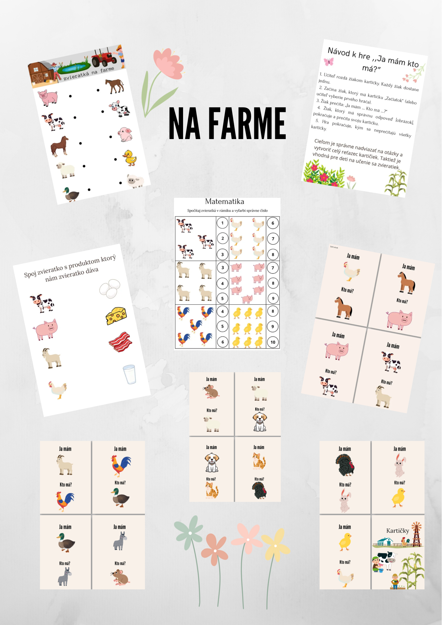 Pracovné listy sú určené pre deti Mš. Súbor obsahuje jednoduché a zábavné úlohy, ktoré podporujú učenie hrou. Deti si upevňujú vedomosti o domácich zvieratách, ich produktoch a zároveň rozvíjajú základné matematické zručnosti do 10. Súčasťou súboru je aj kartičková hra, ktorá je u detí z mojej praxe jednou z obľúbených.