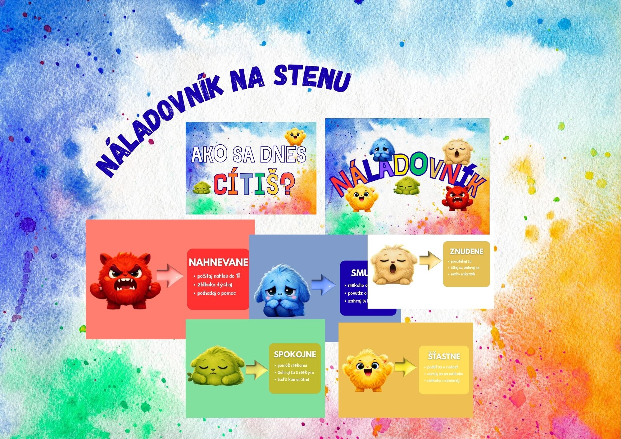 Materiál obsahuje 6 A4+ 1 (2 nadpisy - na výber, 5 emocií). Plagátiky sa buď zalaminujú a nalepia na stenu alebo sa zavesia na špagát a môžu sa na ne použiť štipce s menami detí.