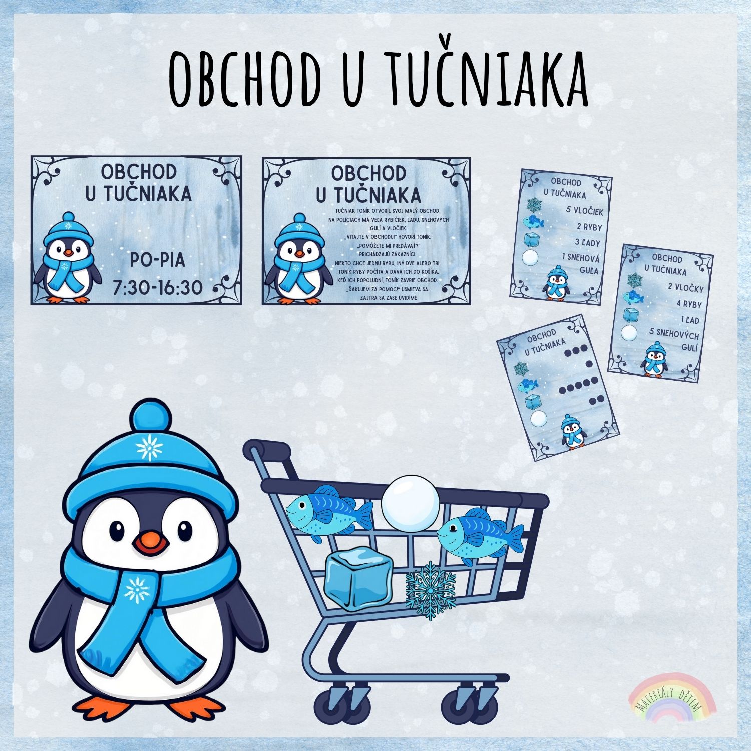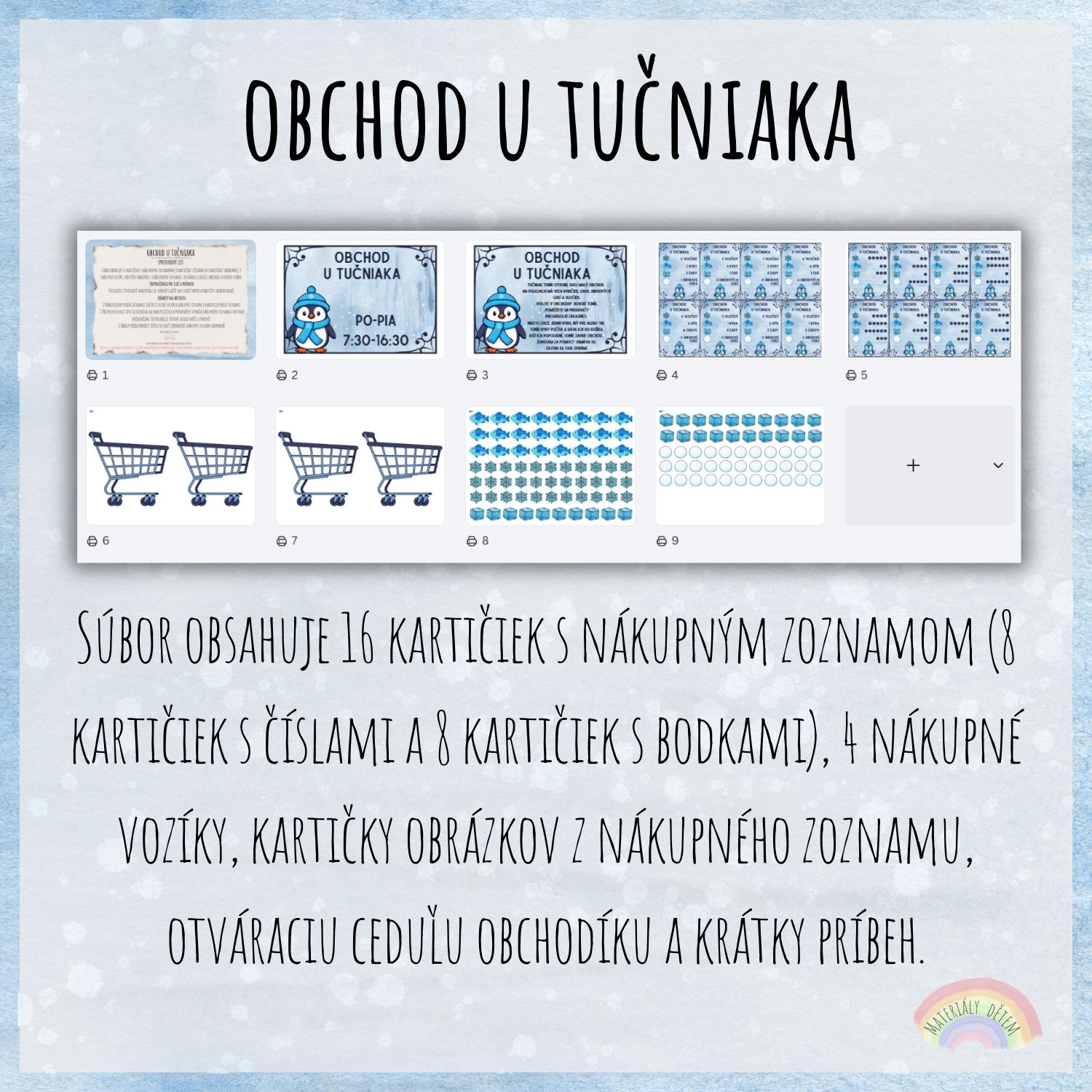 Súbor obsahuje 16 kartičiek s nákupným zoznamom (8 kartičiek s číslami a 8 kartičiek s bodkami), 4 nákupné vozíky, kartičky obrázkov z nákupného zoznamu, otváraciu ceduľu obchodu a krátky príbeh.