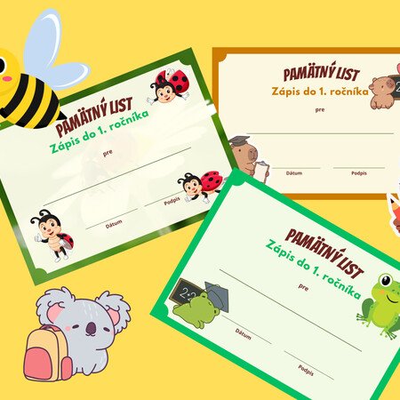 Súbor obsahuje 6 strán na ktorých sa nachádzajú pamätné listy na zápis do 1. ročníka, ktoré si po vytlačení viete vypísať. Každá strana iný motív.