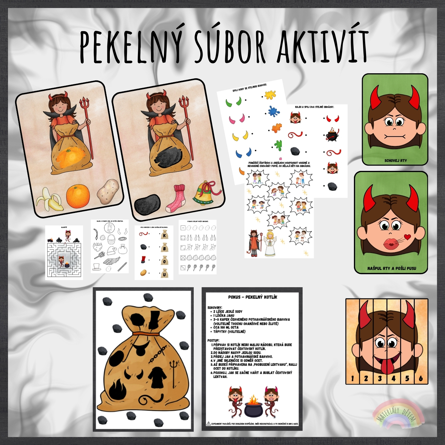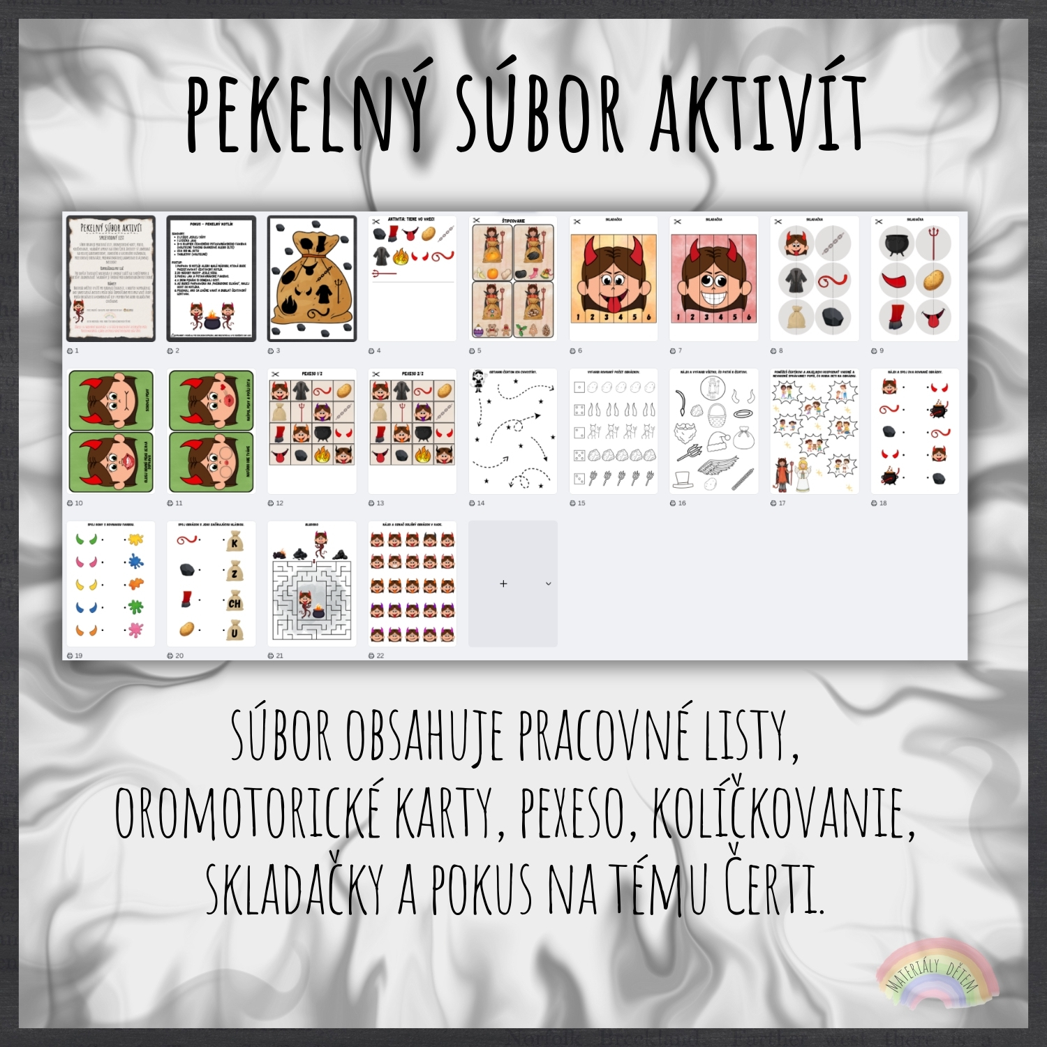 Súbor obsahuje pracovné listy, oromotorické karty, pexeso, kolíčkovanie, skladačky a pokus na tému Čerti. Aktivity sú zamerané na rozvoj grafomotoriky, zrakového a sluchového vnímania, priestorovej orientácie, predmatematickej gramotnosti a jemnej motoriky.