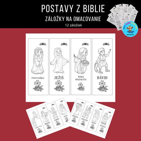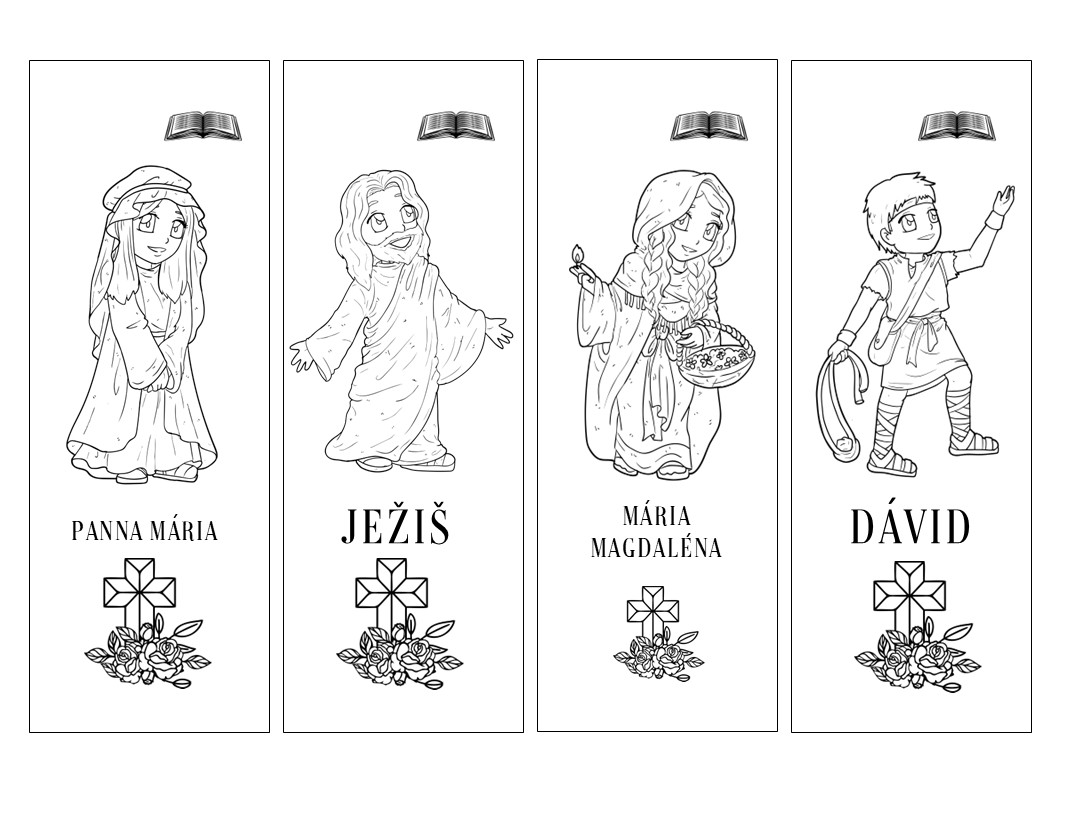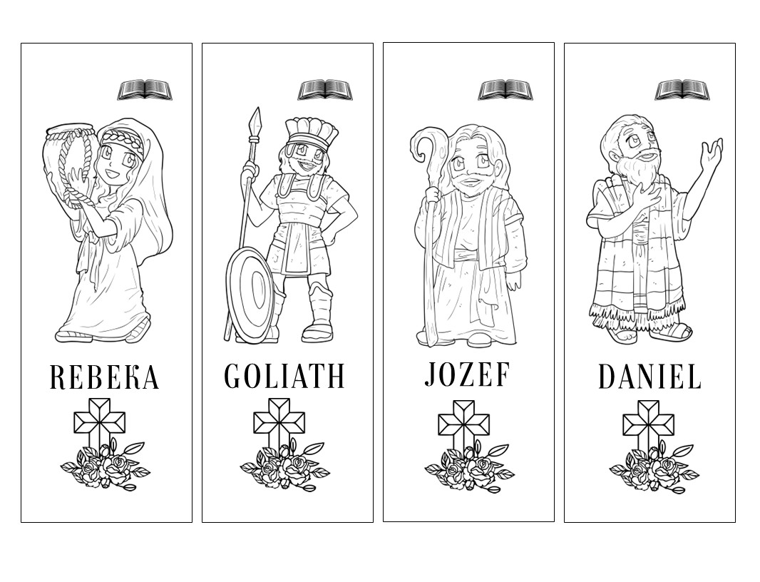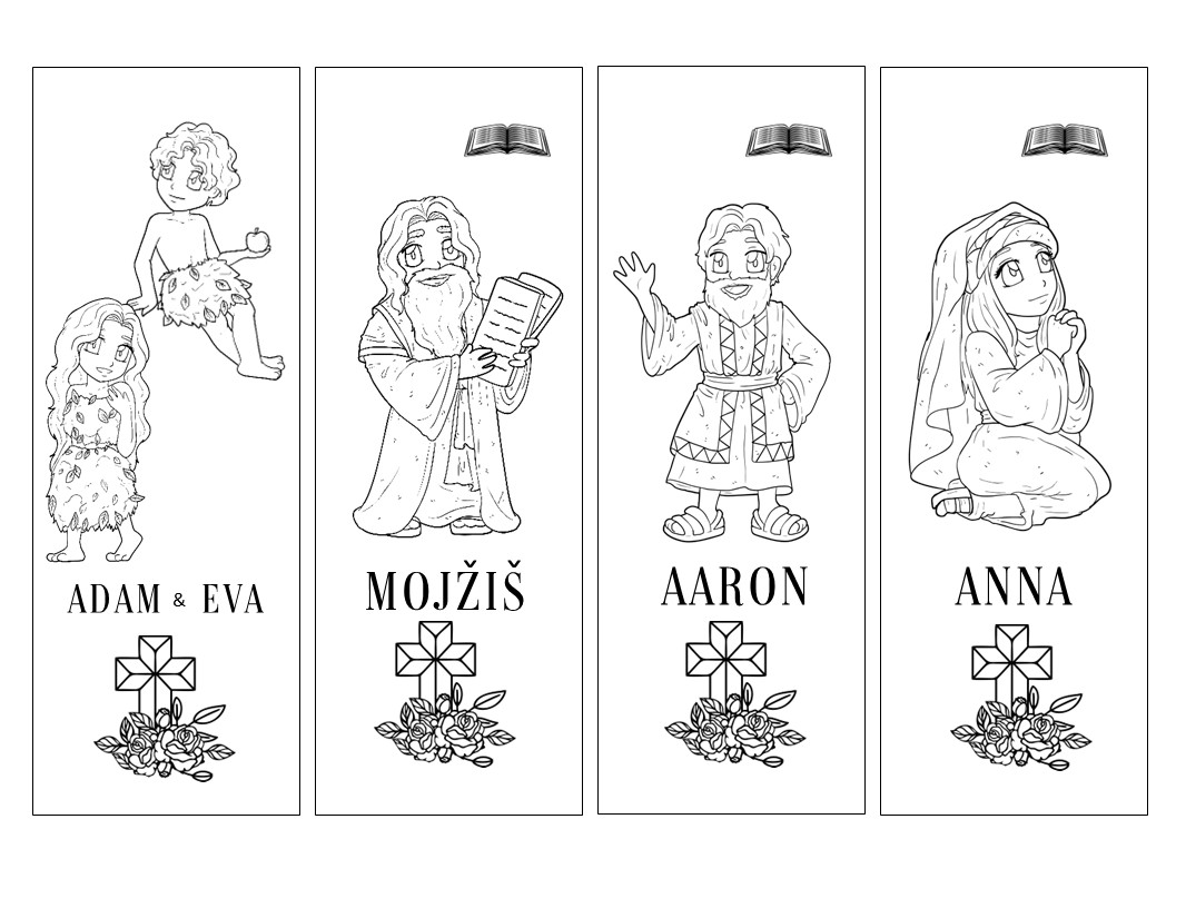Záložky na omaľovanie s postavičkami z biblie. Adam a Eva, Mojžiš, Aaron, Anna, Rebeka, Goliath, Jozef, Daniel, Panna Mária, Ježiš, Mária Magdaléna, Dávid