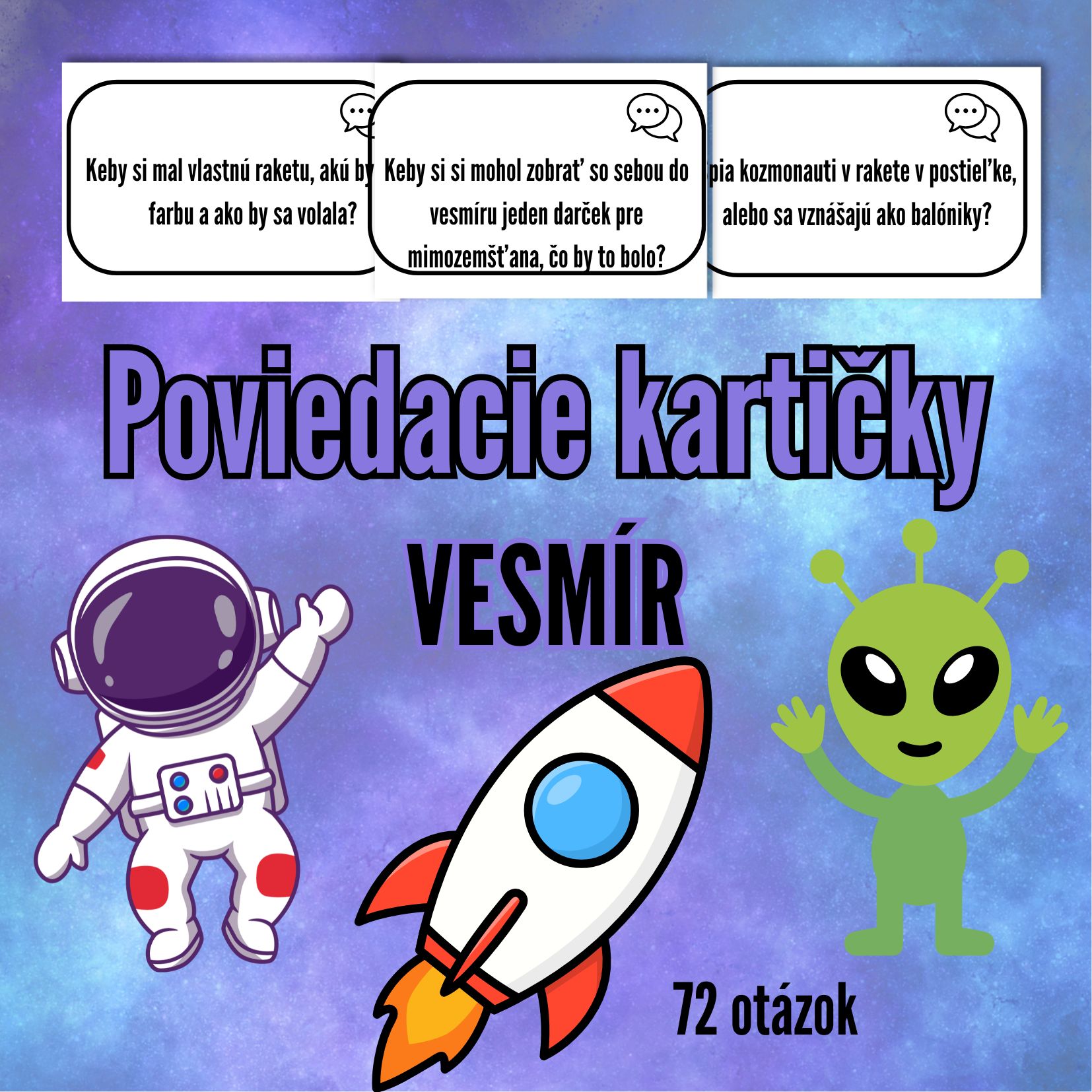 Tento súbor obsahuje 72 originálnych kartičiek zameraných na tému vesmír, ktoré sú ideálnym pomocníkom pre učiteľky v materských školách aj rodičov.