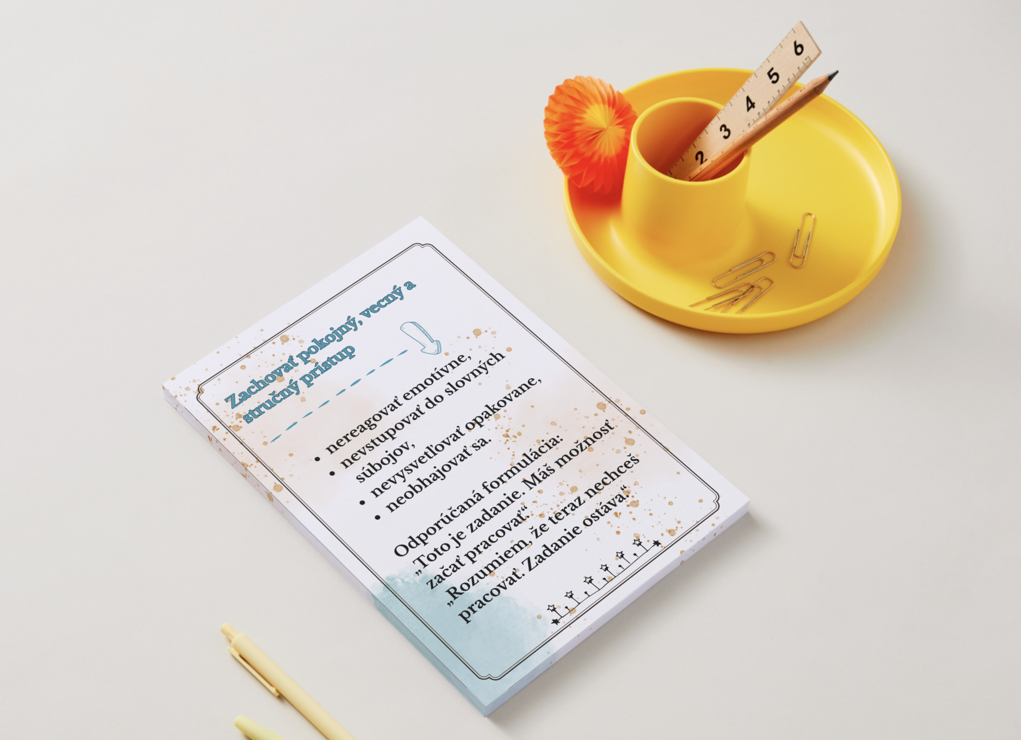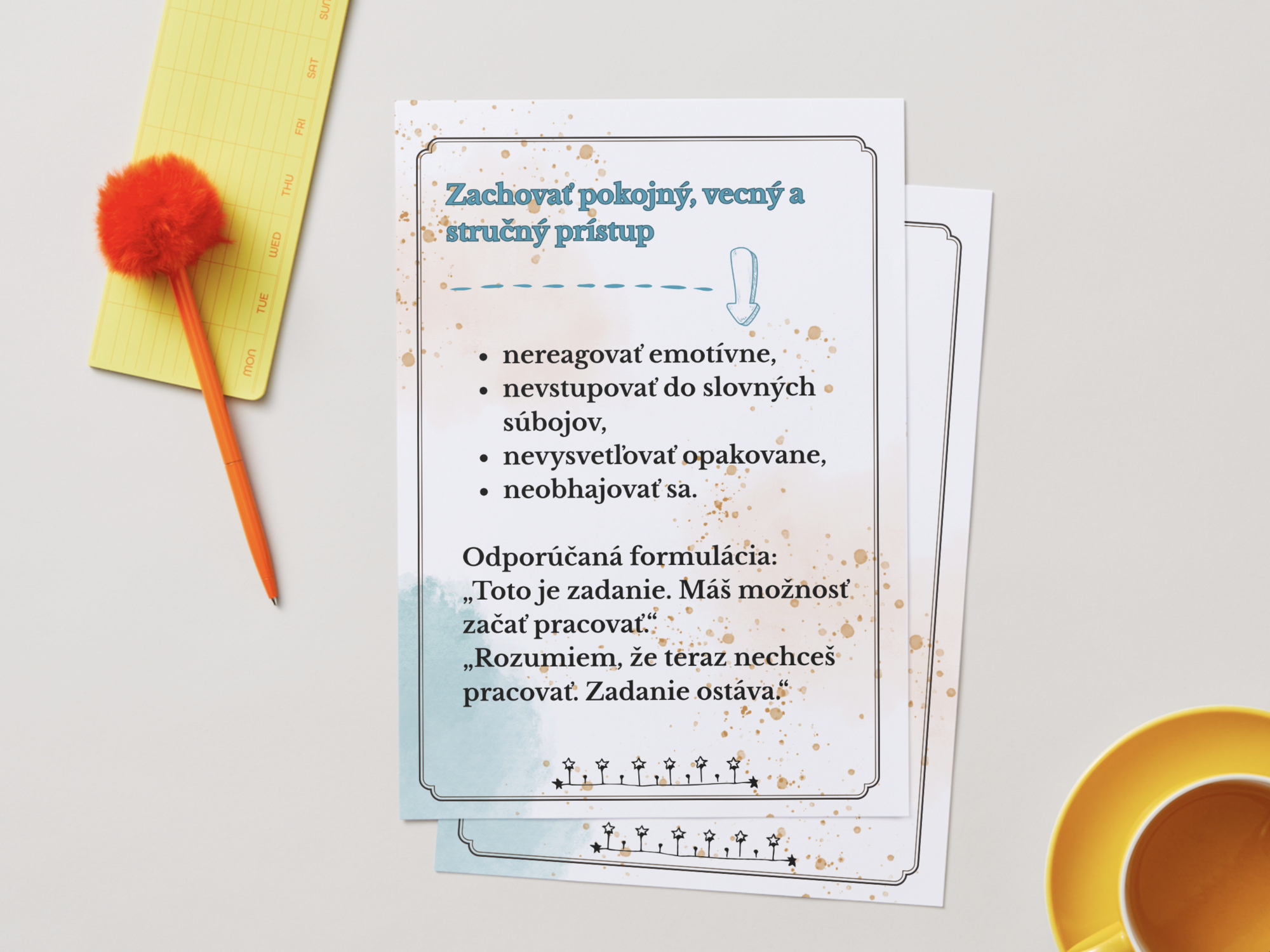 Tento praktický sprievodca vznikol ako pomoc pre učiteľov, ktorí potrebujú mať po ruke konkrétne formulácie, odporúčania a jednoduché zásady, ako zvládať náročné správanie v triede bez zbytočných konfliktov. Materiál ponúka stručné, jasné a okamžite využiteľné postupy do bežnej školskej praxe – pri odmietaní práce, provokácii, verbálnych útokoch aj pri situáciách, keď žiak cielene testuje hranice dospelého.
