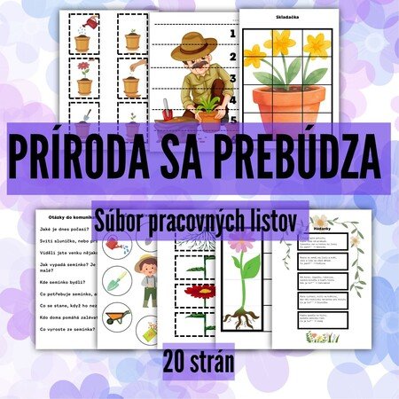 Súbor obsahuje 20 strán pracovných listov, hier a aktivít zameraných na tému jar a prebúdzajúcu sa prírodu. Materiál je vhodný pre deti v materskej škole a pomáha rozvíjať poznávanie prírody, komunikáciu, zrakové vnímanie aj predmatematické zručnosti.