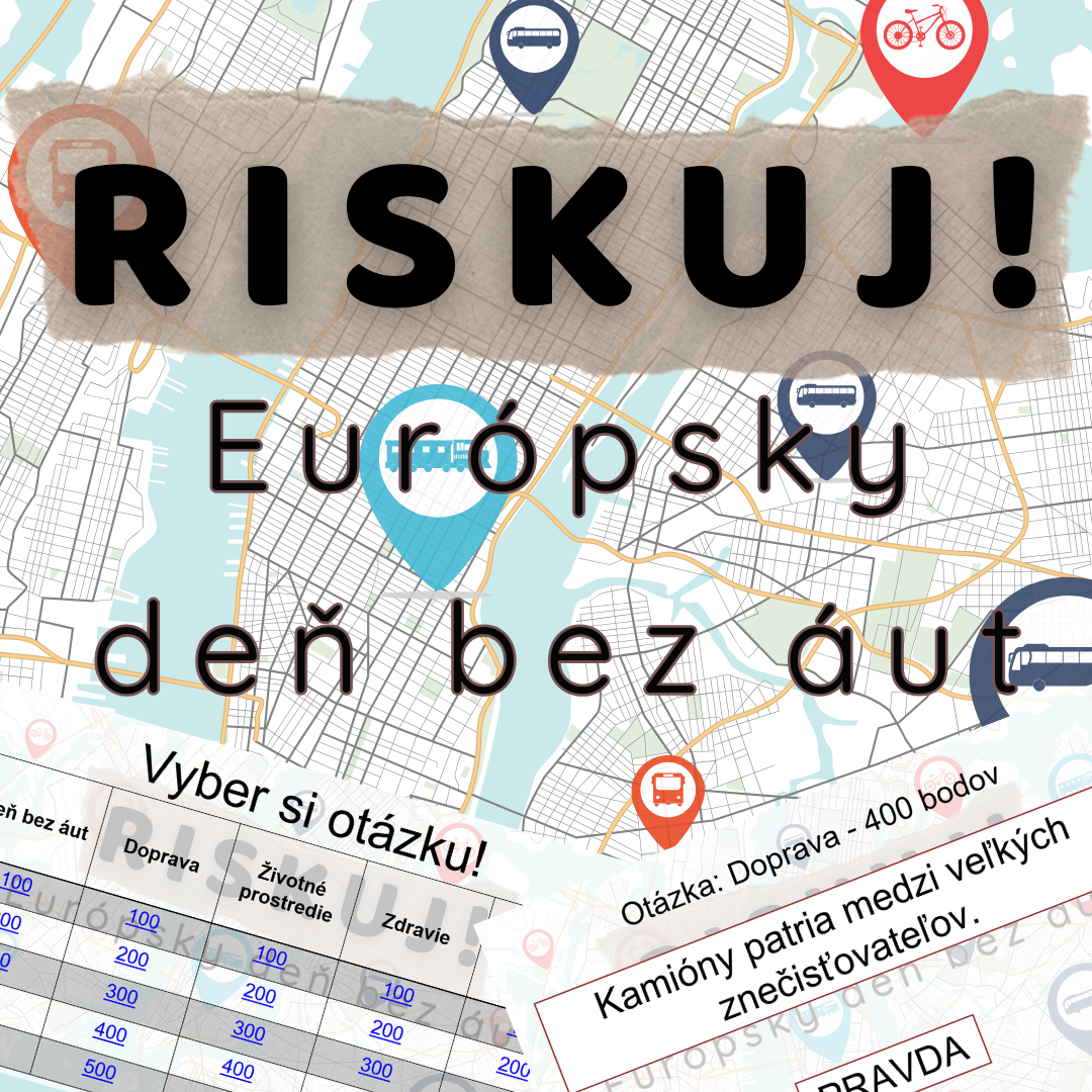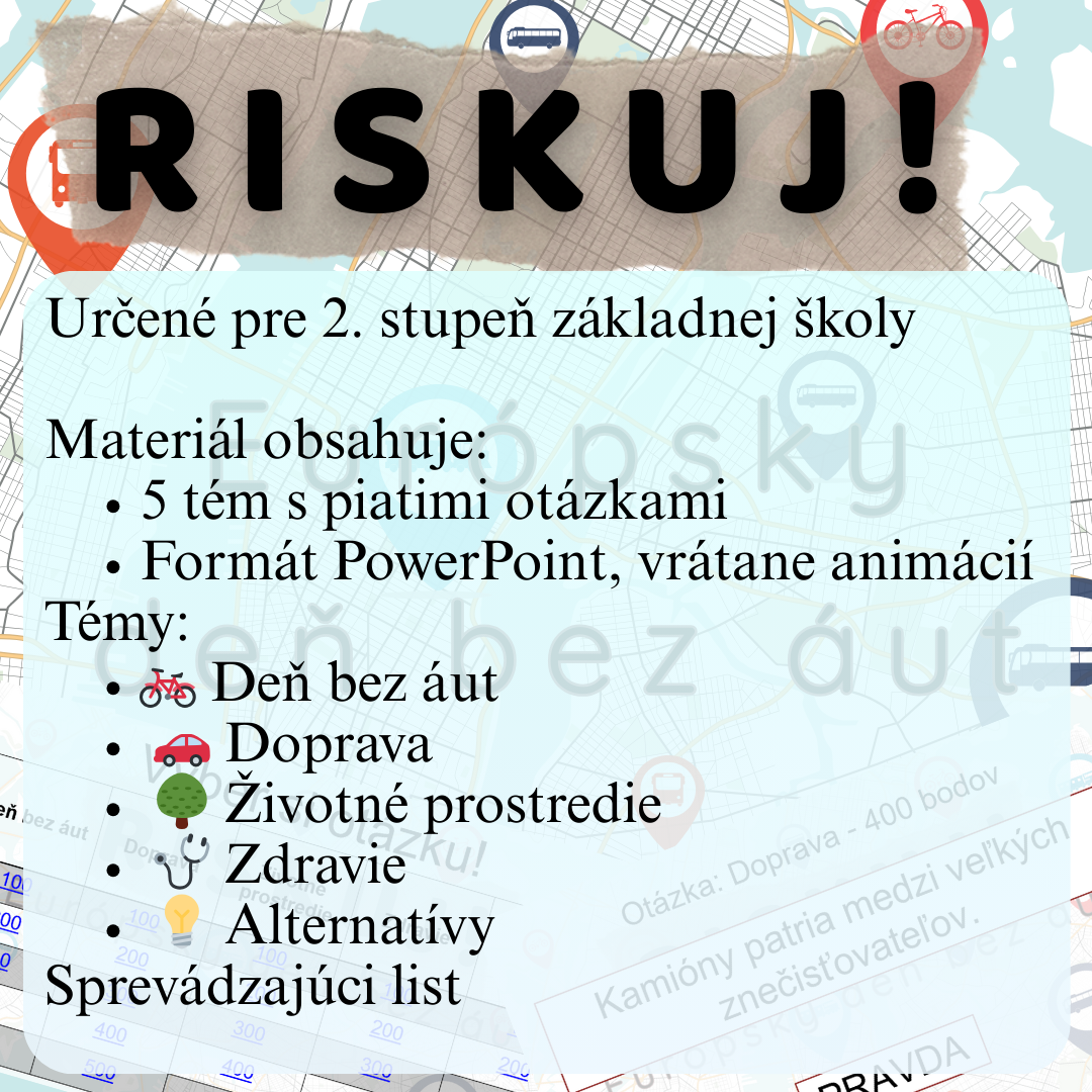 RISKUJ! – Európsky deň bez áut je interaktívna a hravá vzdelávacia aktivita navrhnutá pre žiakov 2. stupňa základnej školy. Predstavuje ideálny spôsob, ako si žiaci môžu zážitkovou a súťaživou formou upevniť a rozšíriť poznatky o udržateľnej doprave, dopadoch automobilovej dopravy na životné prostredie a zdravie, ako aj o možnostiach ekologickejších alternatív – bez zdĺhavého vypytovania či pasívneho memorovania.