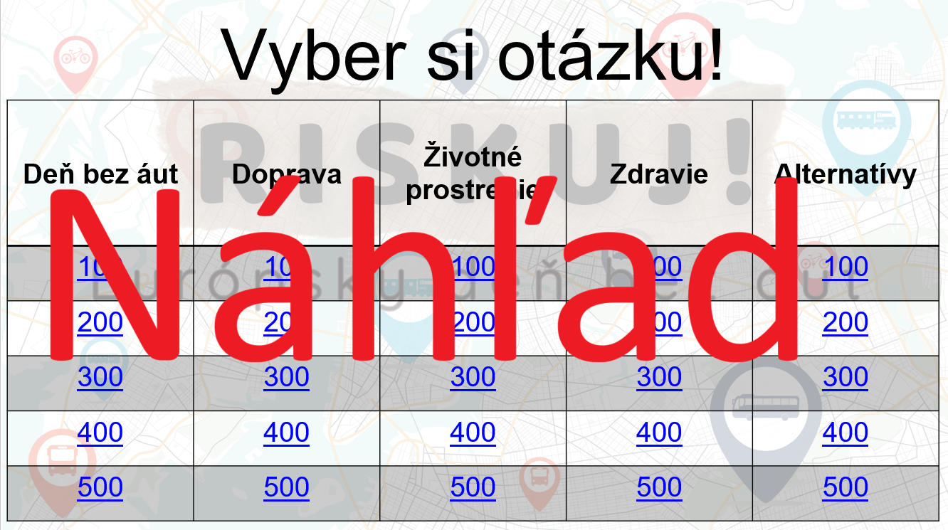 Aktivita je inšpirovaná známou televíznou súťažou „Riskuj!“ – žiaci si vyberajú otázky z piatich tematických okruhov podľa obtiažnosti (100 – 500 bodov) a odpovedajú na výroky typu „pravda / lož“.