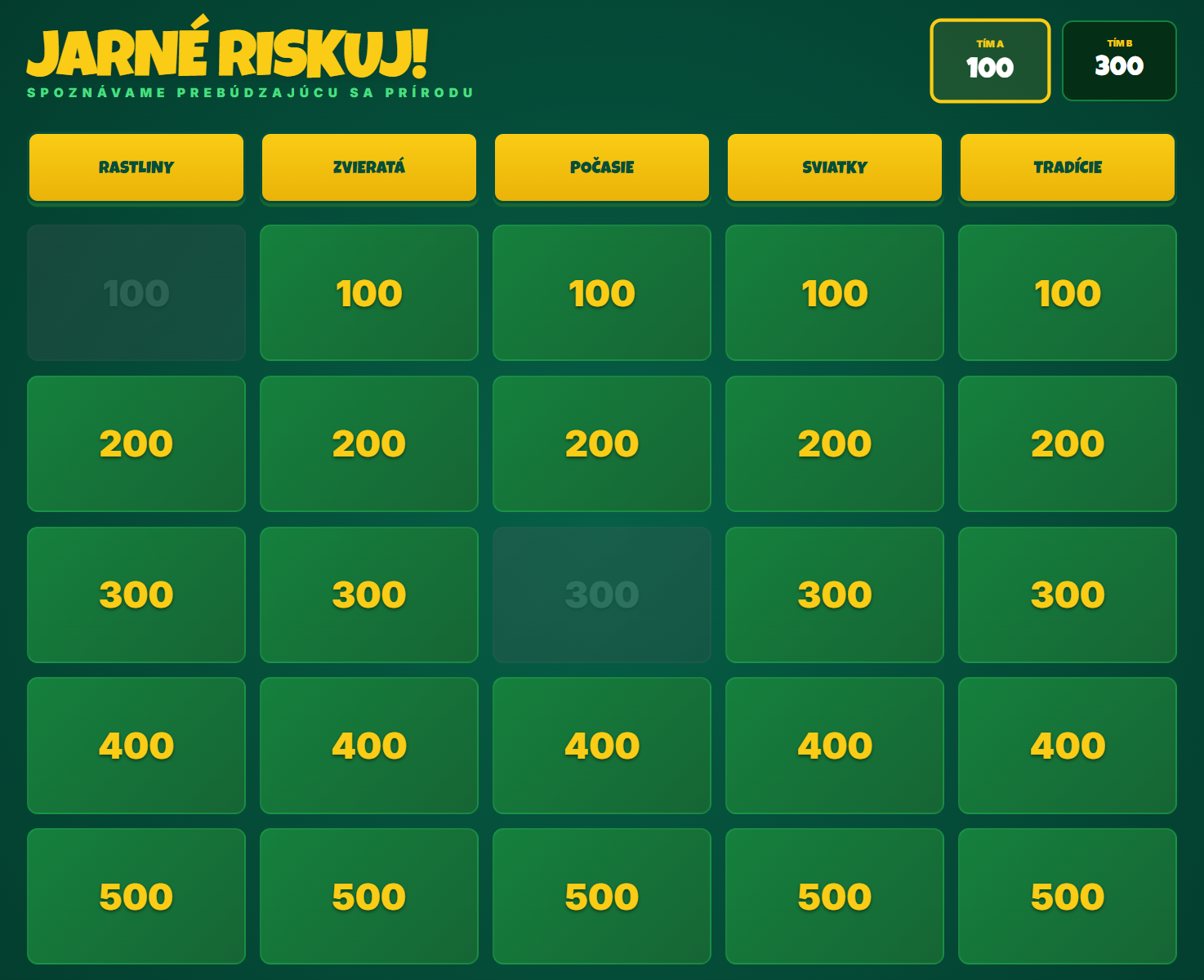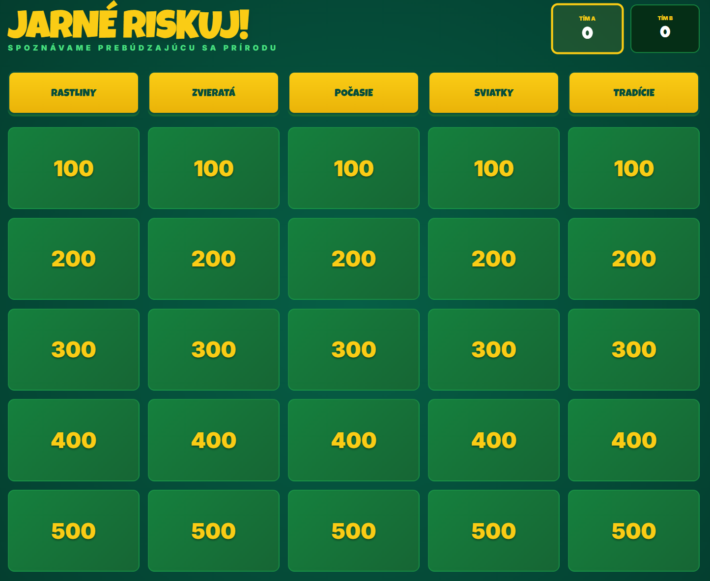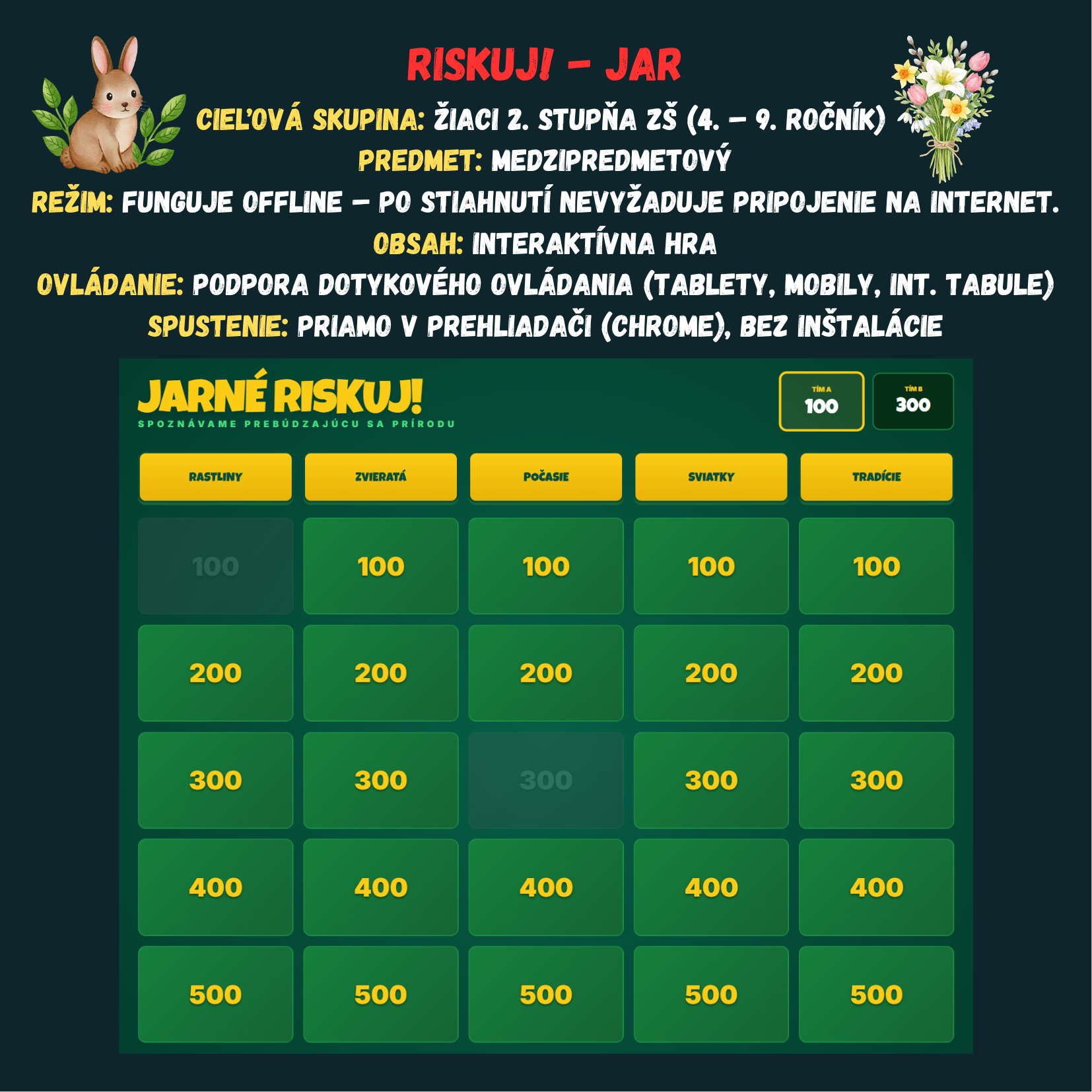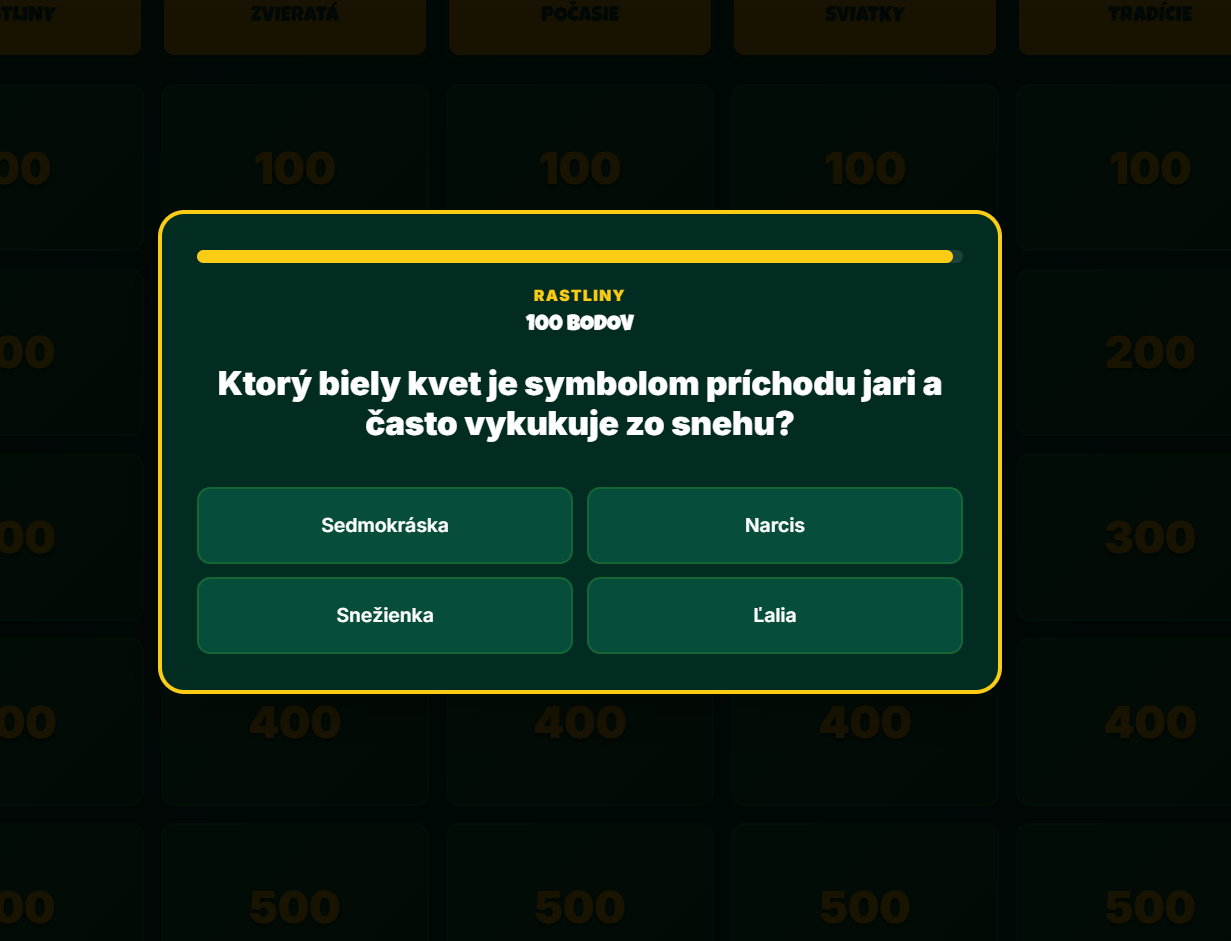 Premeňte hodinu prvouky alebo prírodopisu na napínavý súboj vedomostí! Táto digitálna hra prenáša obľúbený formát televíznej súťaže Riskuj! priamo do vašej triedy. Žiaci sa hravou formou naučia všetko o jarných kvetoch, návrate vtáctva, ľudových tradíciách aj astronomických zákonitostiach jari.