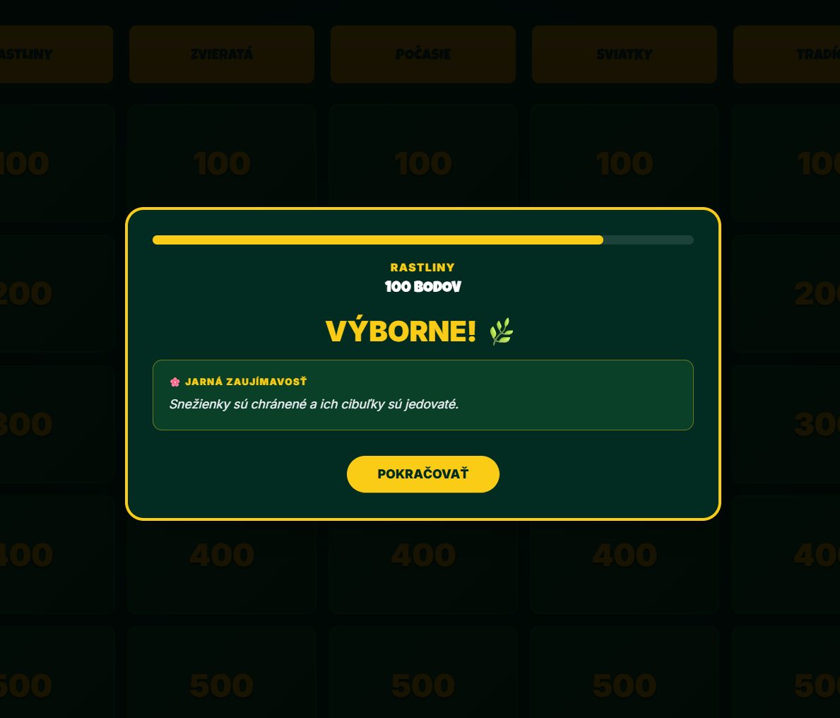 - Vzdelávací presah: Po každej správnej aj nesprávnej odpovedi sa zobrazí „Jarná zaujímavosť“, ktorá žiakom približuje fakty o prírode a zvykoch.