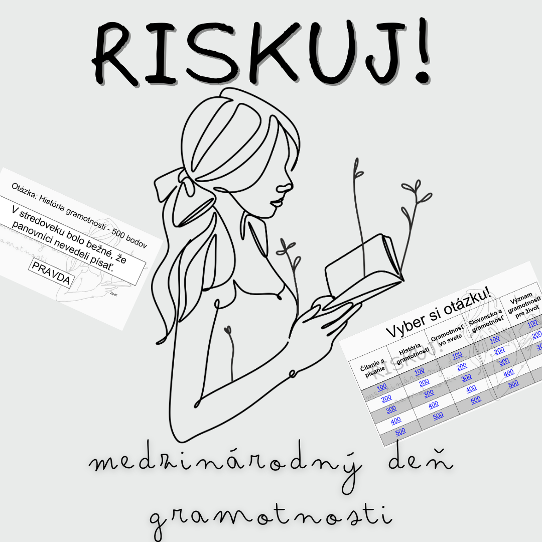RISKUJ! – Medzinárodný deň gramotnosti je interaktívna a hravá vzdelávacia aktivita navrhnutá pre žiakov 2. stupňa základnej školy. Predstavuje ideálny spôsob, ako si žiaci môžu zážitkovou a súťaživou formou upevniť a rozšíriť poznatky o gramotnosti – jej histórii, význame, súčasnom stave vo svete i u nás – bez zdĺhavého vypytovania či pasívneho memorovania.