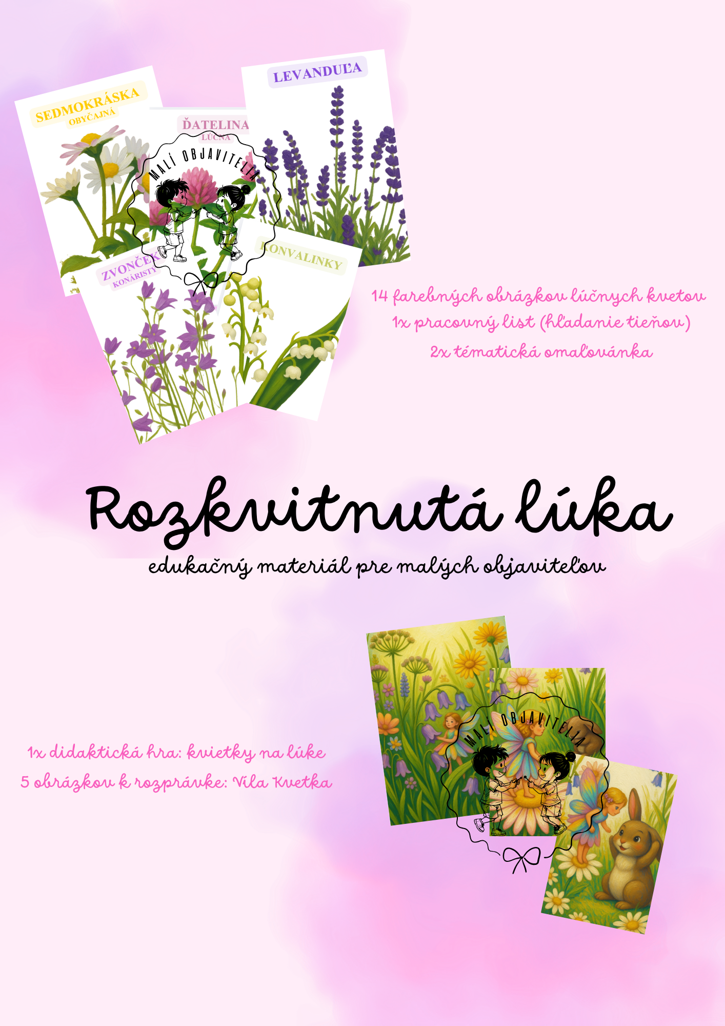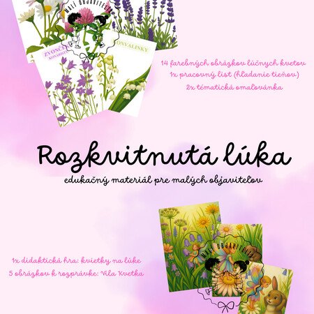 - Zábavu a kreativitu: Tematické omaľovánky a farebnú didaktickú hru na skladanie lúky podľa predlohy.
