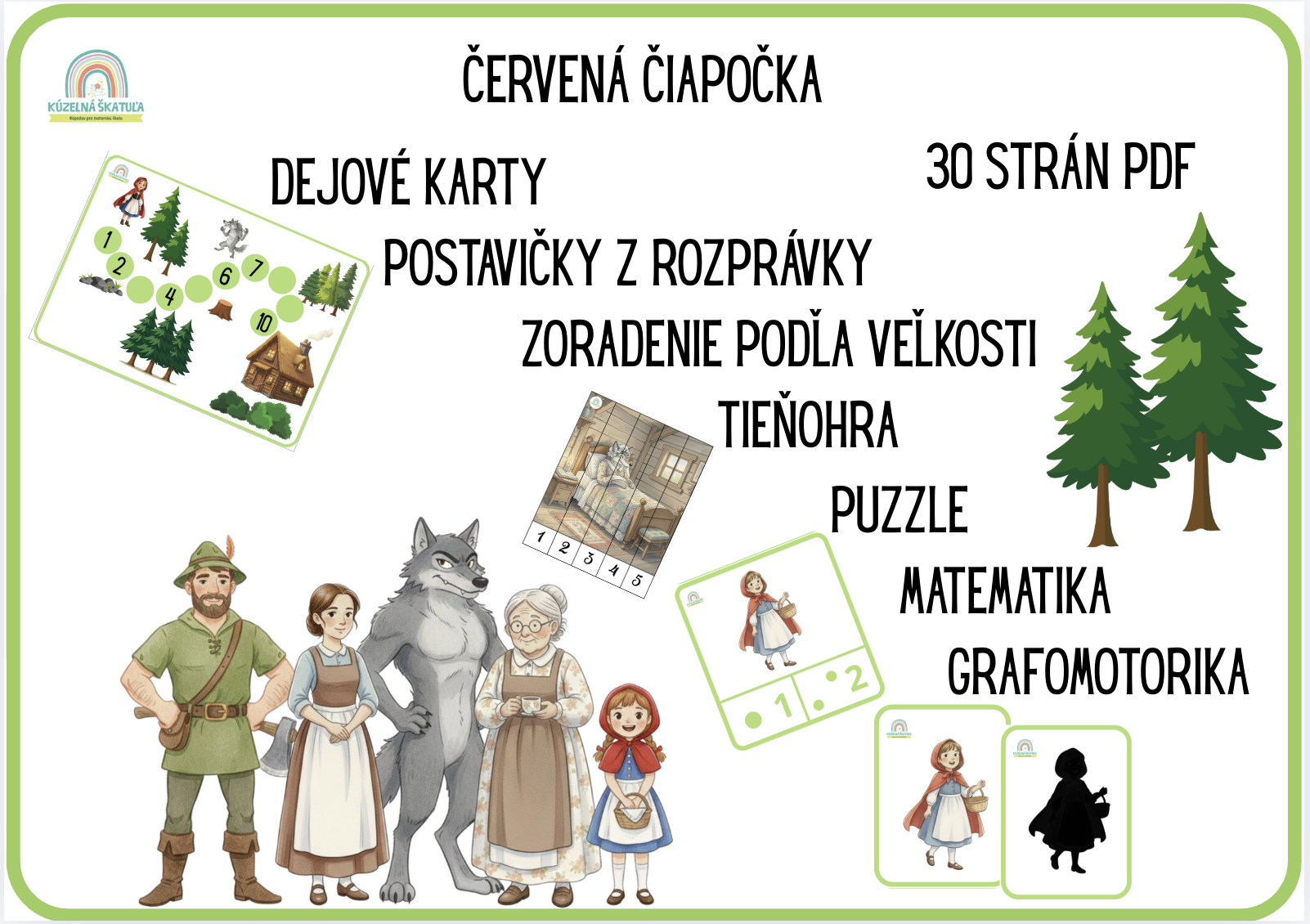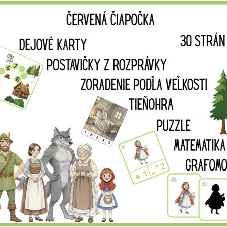 - Postavičky a kulisy: Všetci hrdinovia sú pripravení na vystrihnutie a dramatizáciu rozprávky.