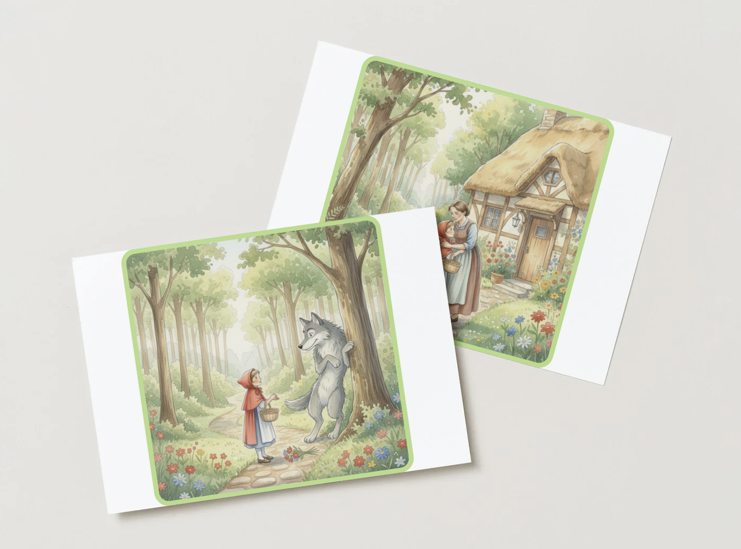 - Príbeh a postupnosť: Obrázky postupu deja, pomocou ktorých deti trénujú rozprávanie a pamäť.