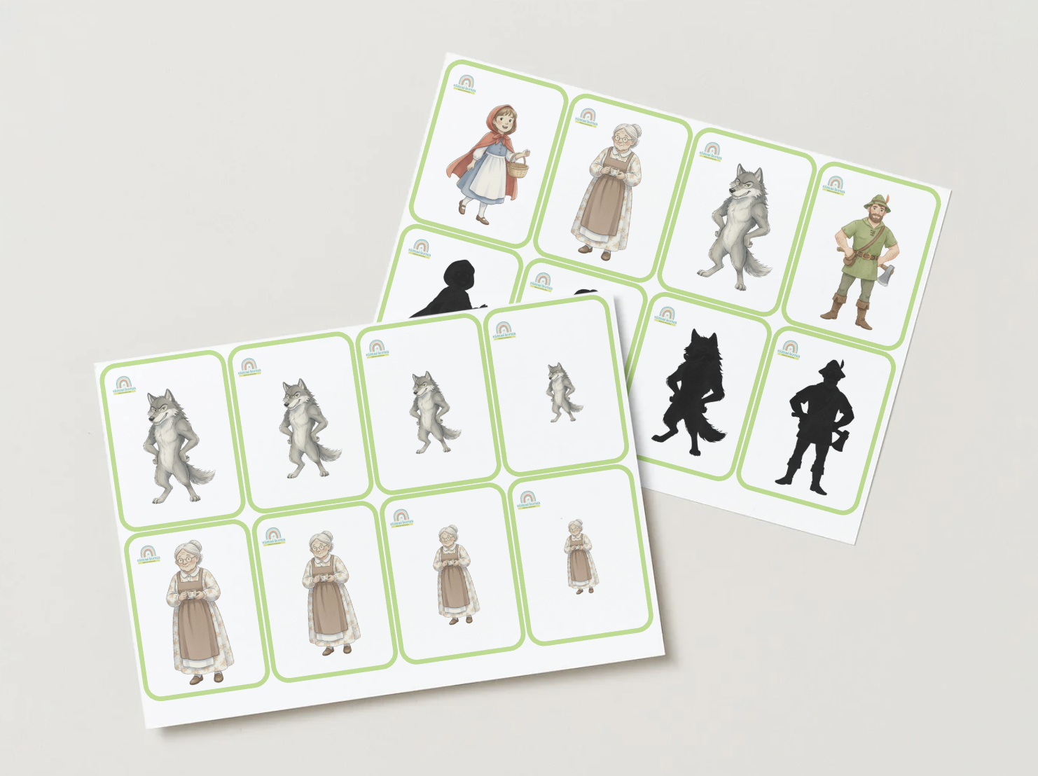 - Tieňohra: Špeciálne karty, kde deti priraďujú postavičky k ich správnym tieňom – ideálne na rozvoj zrakovej diferenciácie.
