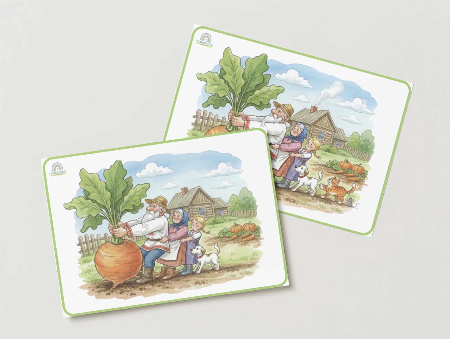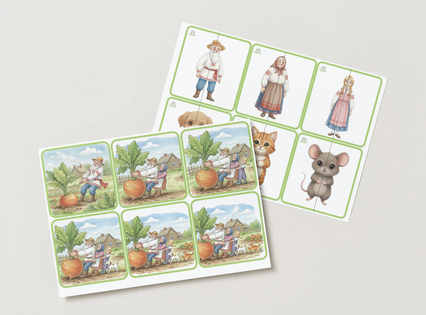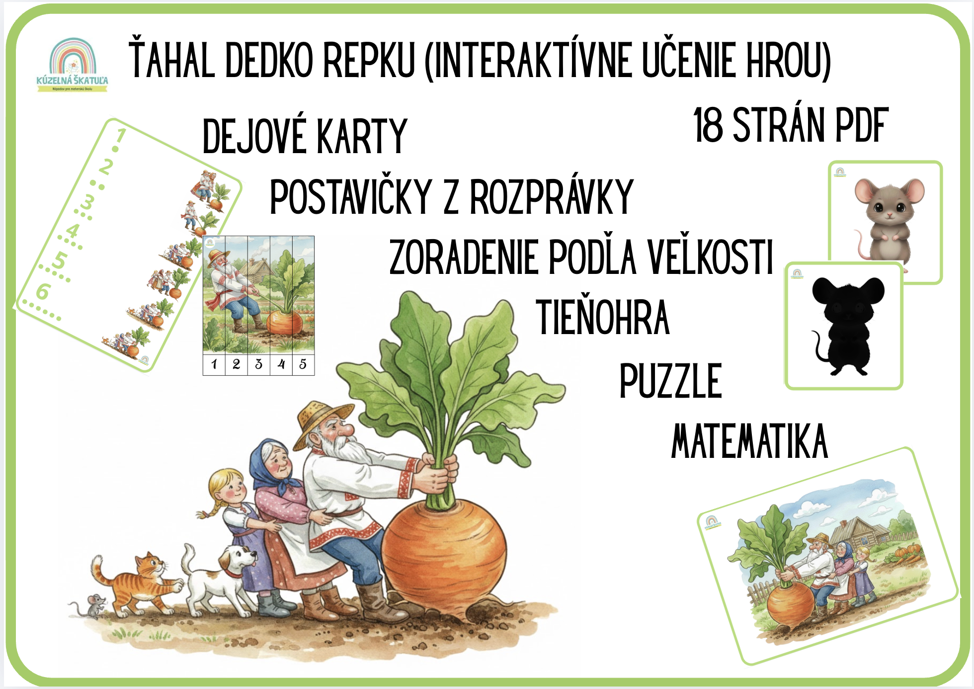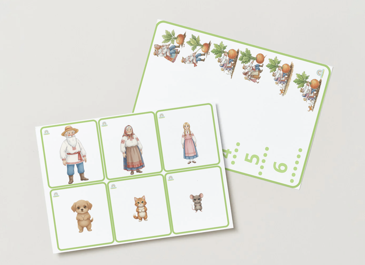 - Príbeh a postupnosť: Obrázky postupu deja, pomocou ktorých deti trénujú rozprávanie a pamäť (kto prišiel k repke ako prvý a kto posledný).