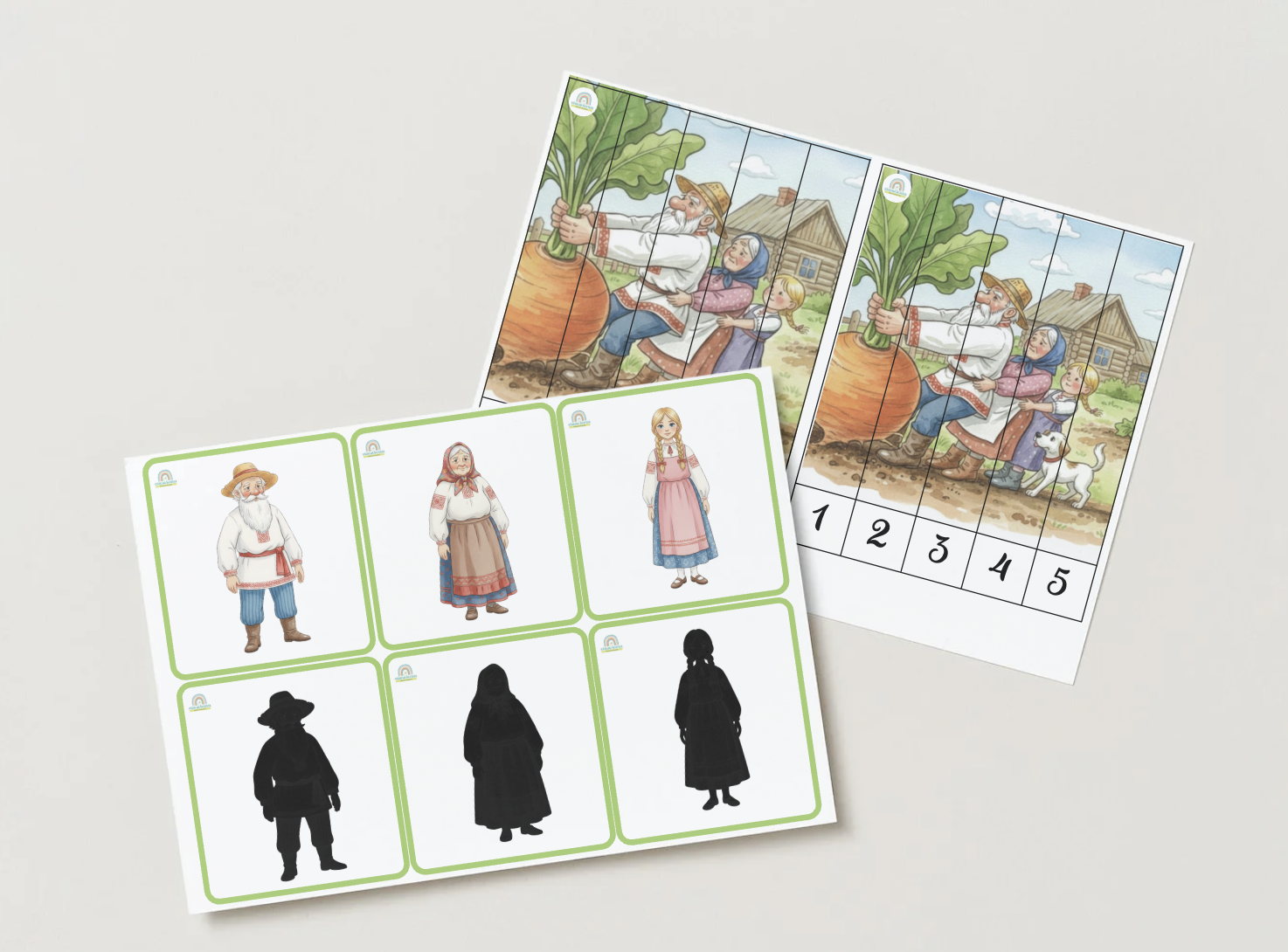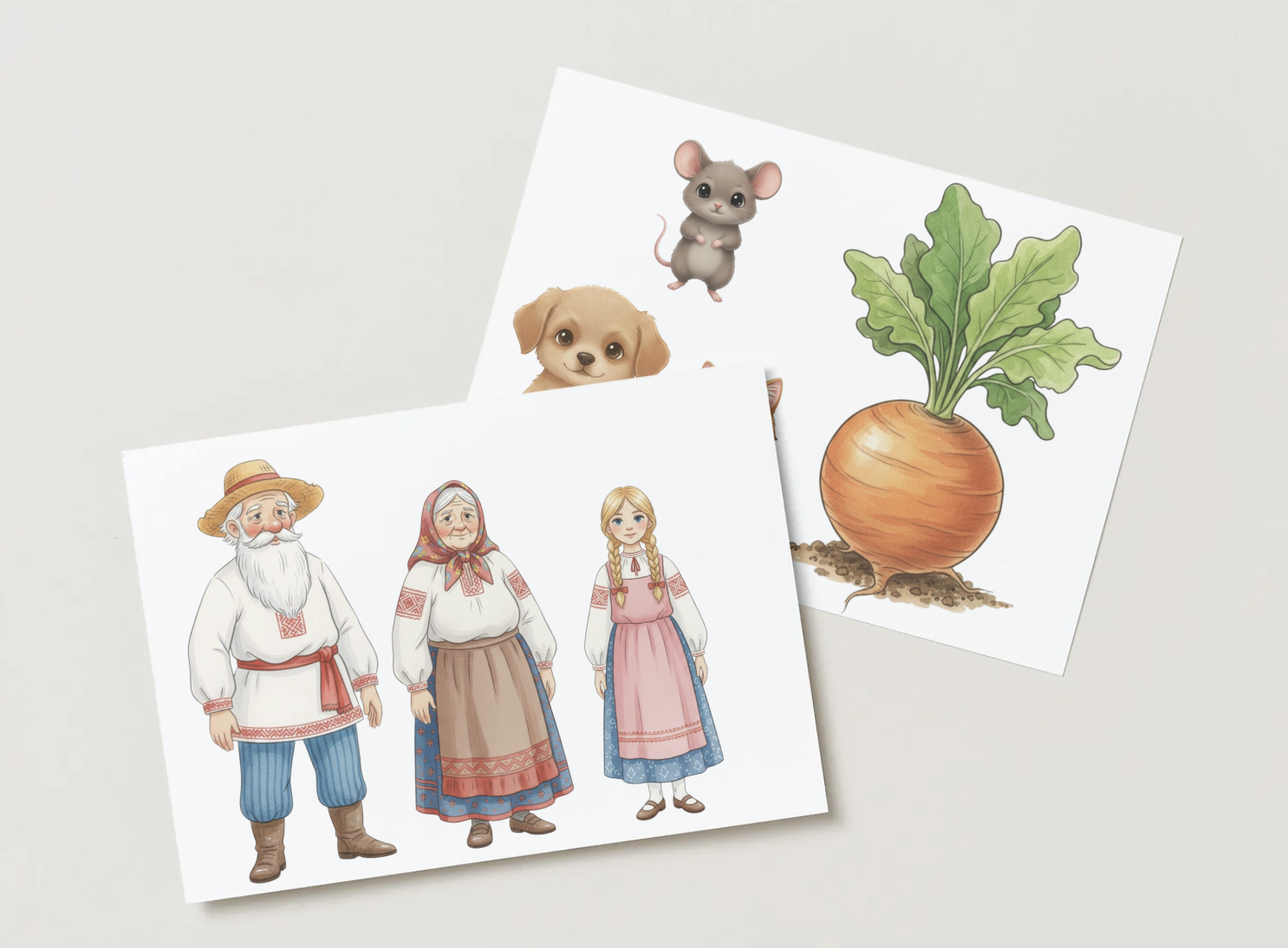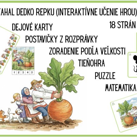 - Postavičky a kulisy: Všetci hrdinovia od dedka až po myšku, pripravení na vystrihnutie a dramatizáciu rozprávky.