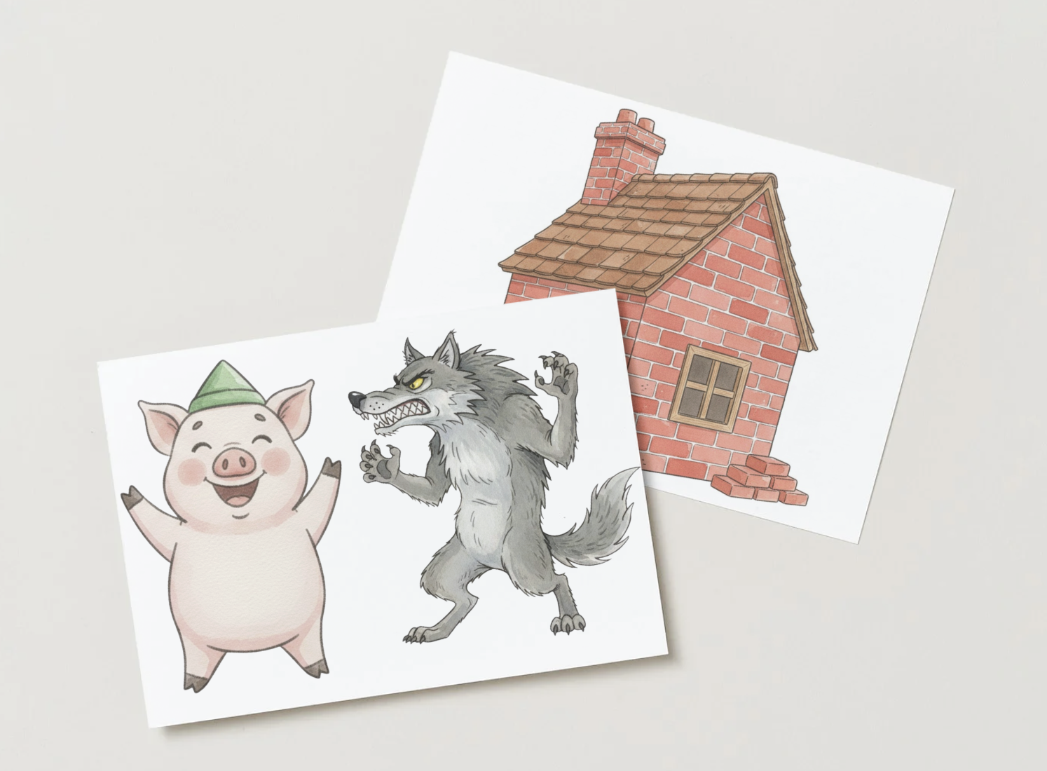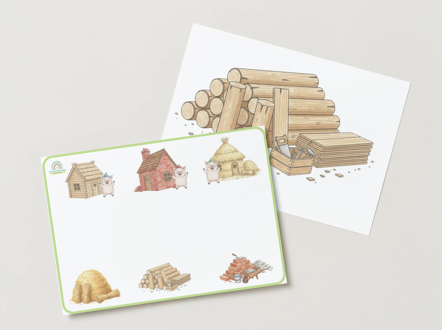 - Domčeky a materiály: Obrázky slameného, dreveného a tehlového domčeka spolu s priraďovacími kartičkami materiálov (slama, drevo, tehla). Deti tak pochopia súvislosť medzi surovinou a výslednou stavbou.