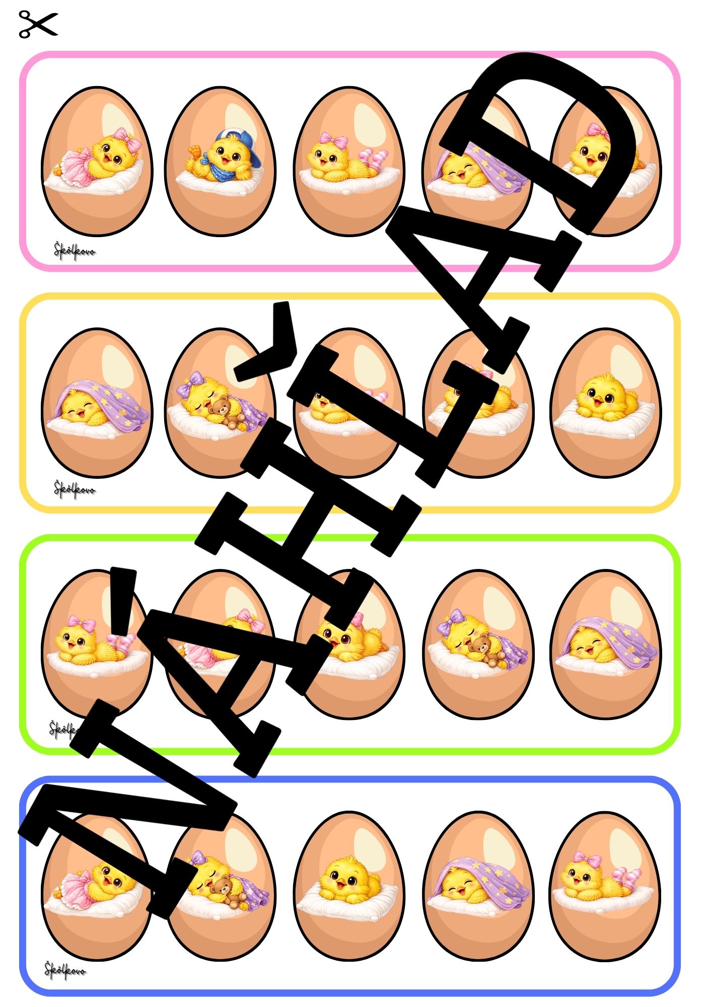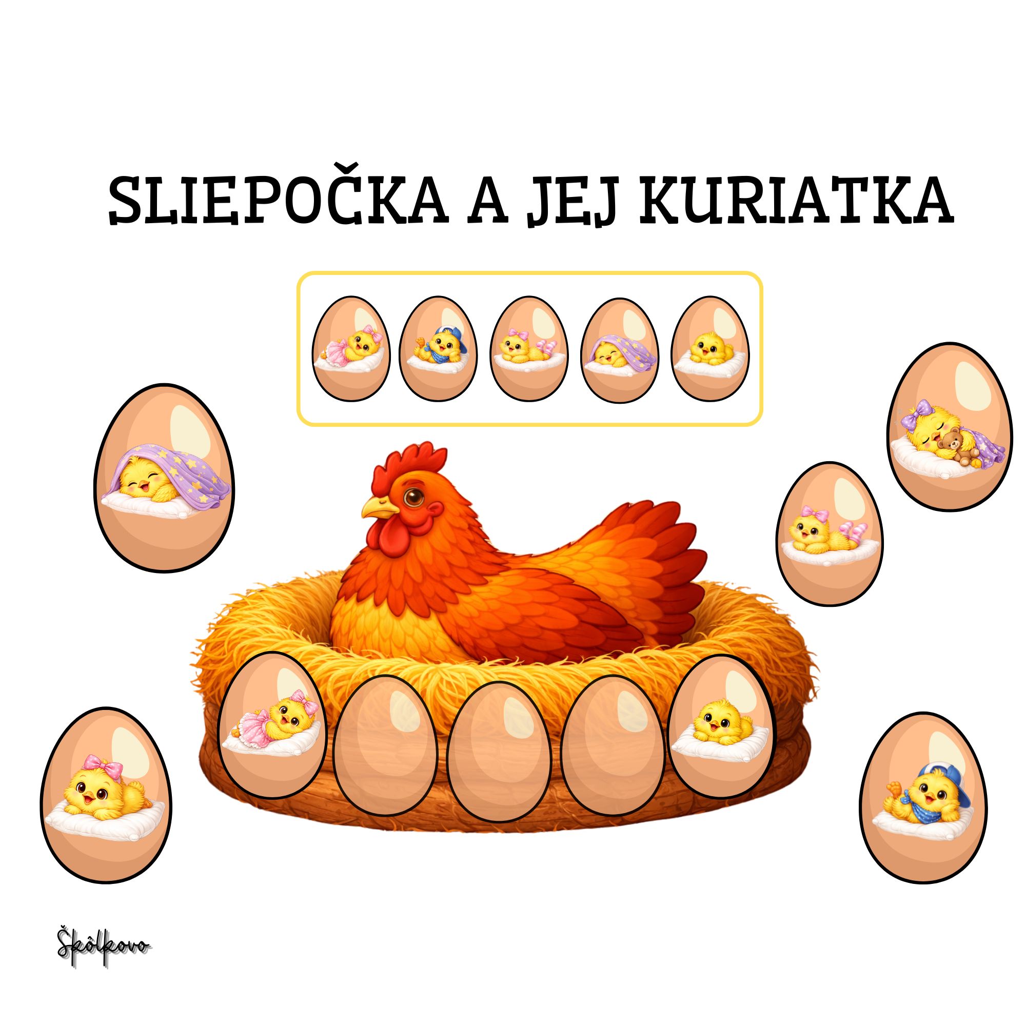Deti pozorujú obrázkový vzor, na ktorom sú zobrazené kuriatka ukryté vo vajíčkach v rôznych polohách. Ich úlohou je správne uložiť jednotlivé kuriatka do vajíčok tak, aby sa zhodovali s predloženým vzorom. Každé vajíčko obsahuje iné kuriatko, preto musia deti pozorne sledovať detaily obrázka a porovnávať ich umiestnenie.