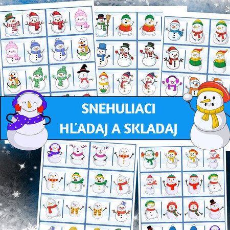 Snehuliaci – hľadaj a skladaj je zimná obrázková aktivita inšpirovaná princípom domina, určená pre deti predškolského a mladšieho školského veku. Deti pracujú s obrázkovými kartami, hľadajú rovnakých snehuliakov a správne ich nadväzujú do radu, čím vzniká tzv. domino had. Aktivita prirodzene podporuje sústredenie, vizuálnu pamäť a schopnosť porovnávania detailov.