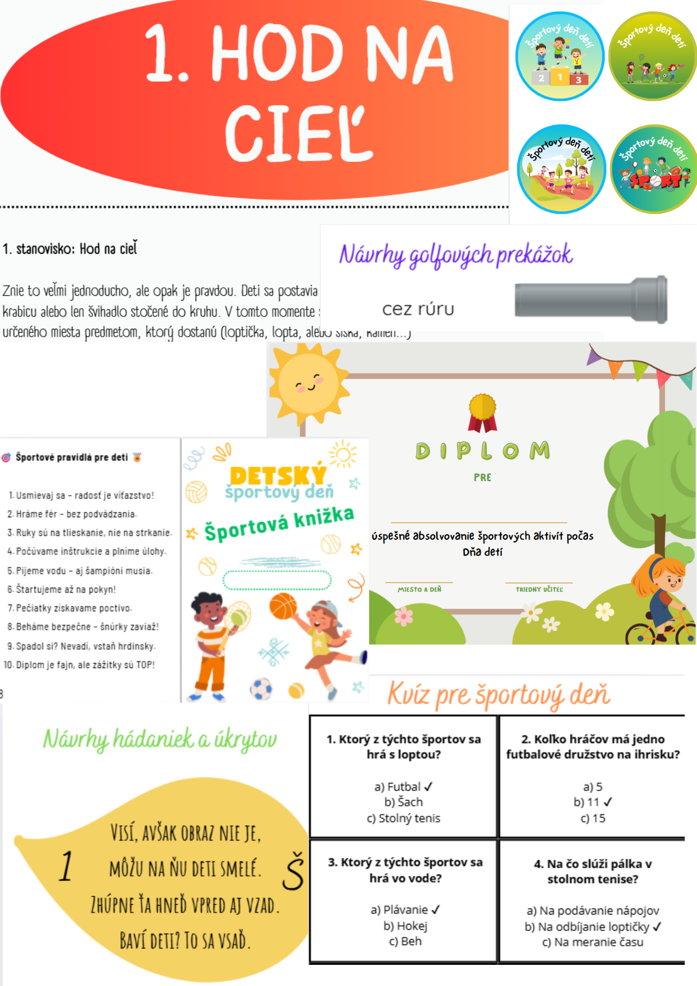 Návrh na prípravu na Športový deň detí - hľadanie kartičiek, športový kvíz a rôzne závabné športové úlohy (hádzanie bez pozerania, chodenie bez dotknutia sa zeme, naberanie bez použitia rúk, golf..). Celkovo 10 aktivít, 3 návrhy na diplomy, 8 návrhov na medailu a športová knižka, kam môžu zbierať pečiatky za zvládnutie aktivít. Úvodná reč na privítanie v súbore .docx pre možnosť prispôsobenia si.