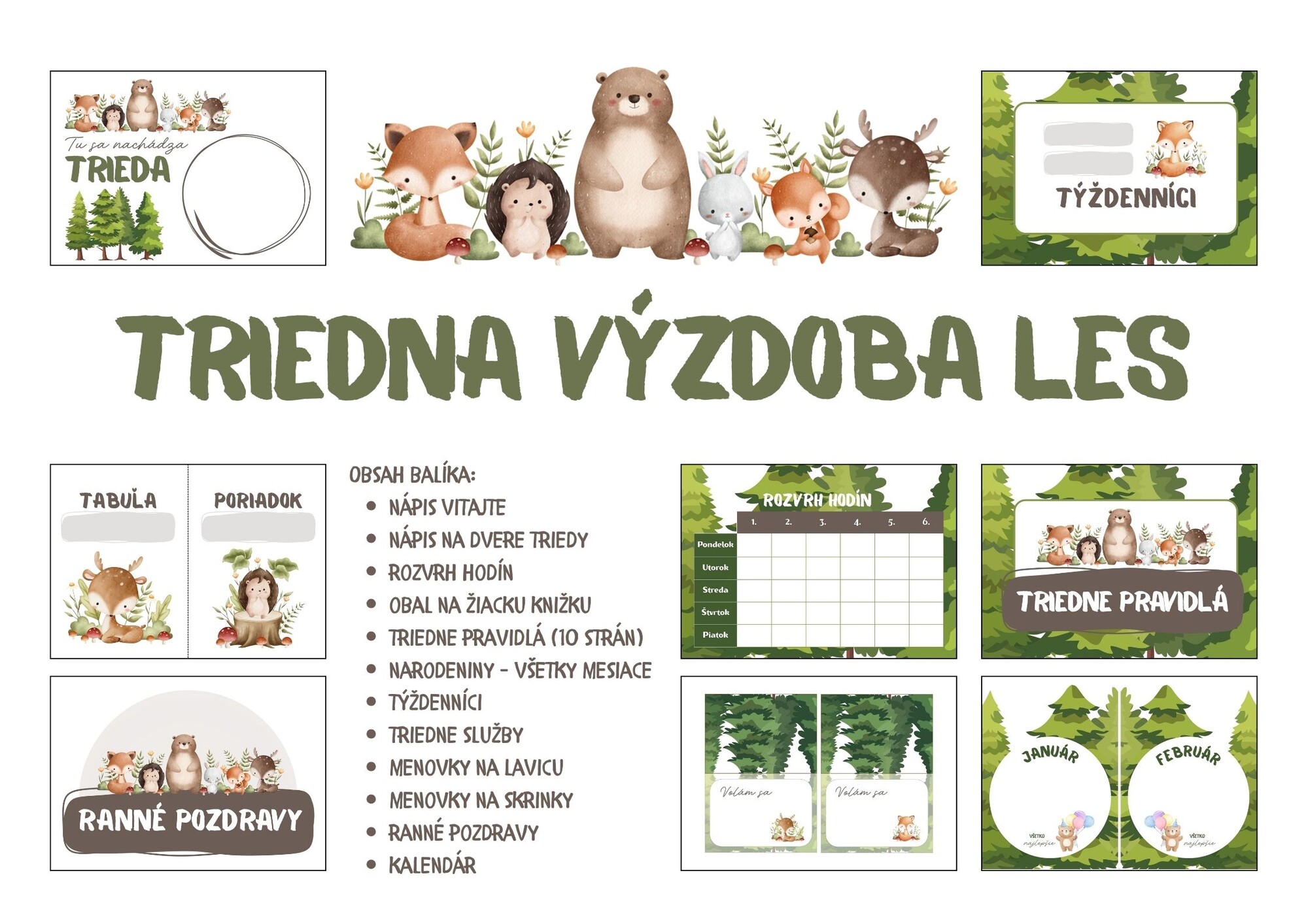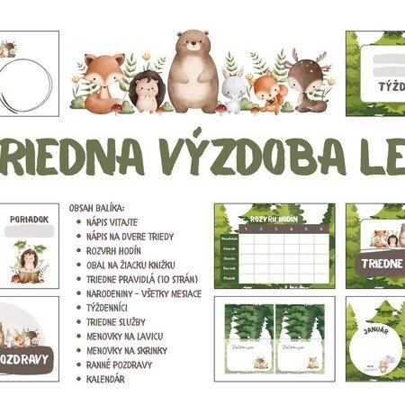 Obsah balíka: nápis vitajte, nápis na dvere triedy, rozvrh hodín, obal na žiacku knižku, triedne pravidlá (10 strán), narodeniny – všetky mesiace, týždenníci, triedne služby, menovky na lavicu, menovky na skrinky, ranné pozdravy, kalendár.