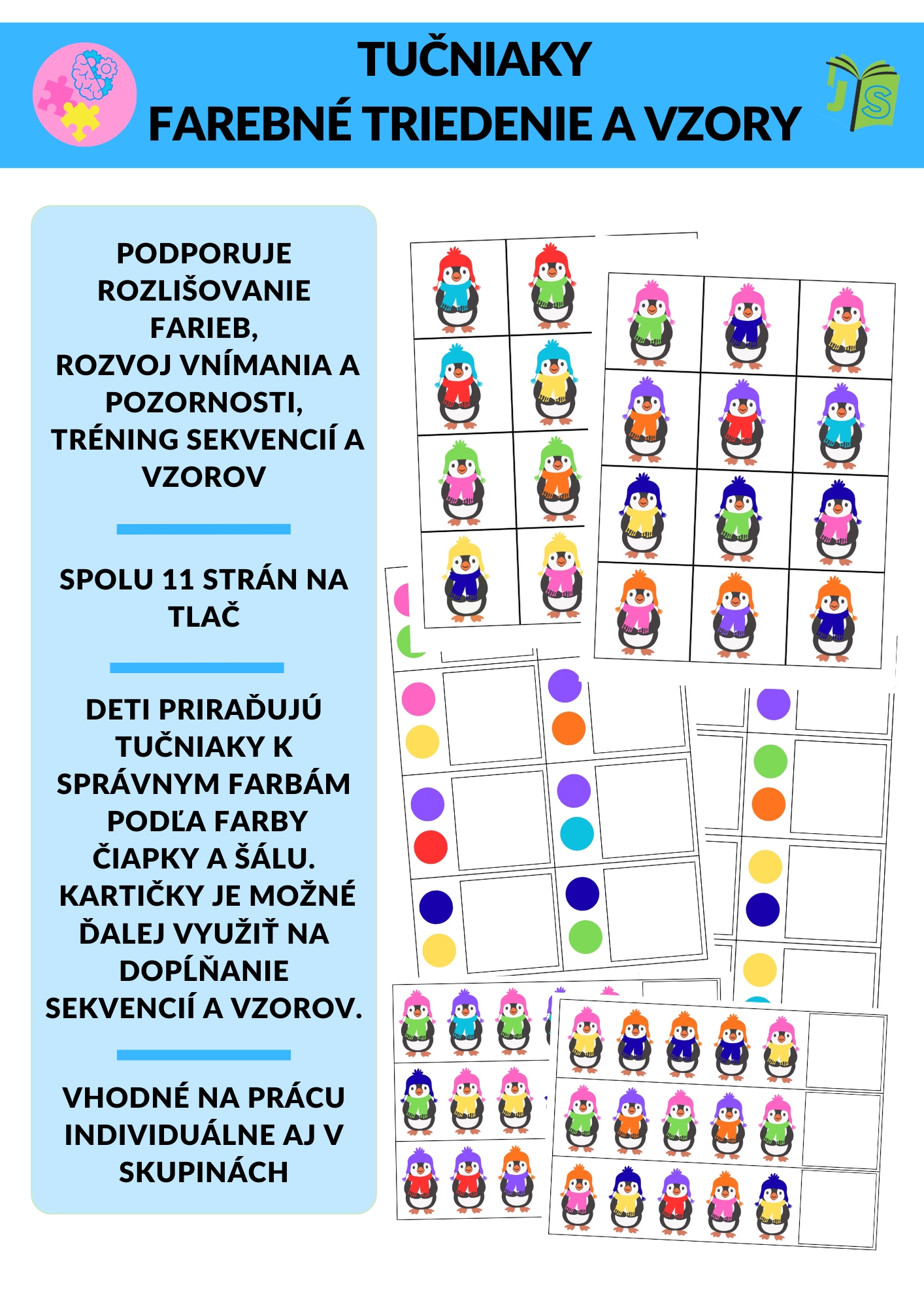Súčasťou sady sú kartičky s tučniakmi a pracovné listy na triedenie a sekvencie. Aktivita je využiteľná aj pre špeciálnu pedagogiku a rozvoj jemnej motoriky.