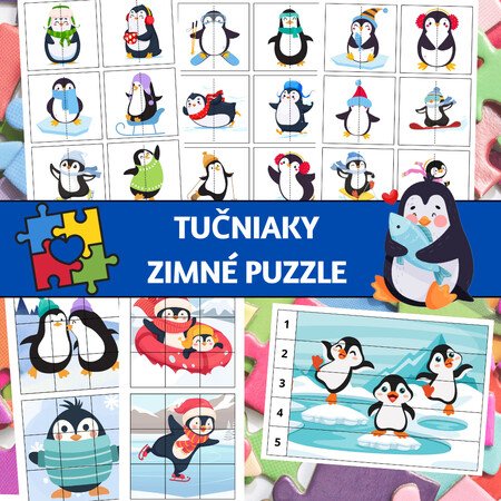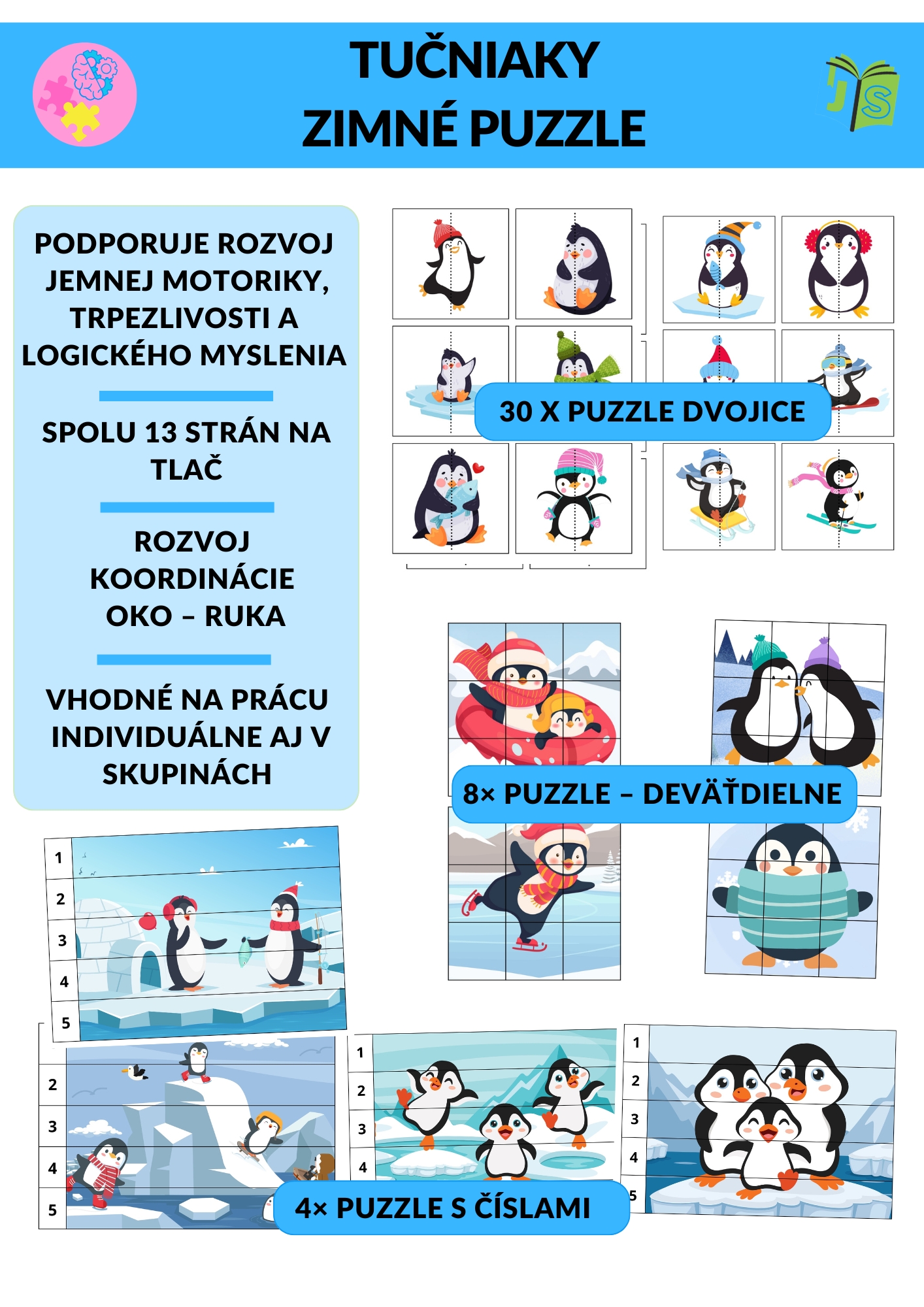 Zimné puzzle s tučniakmi určené na rozvoj jemnej motoriky, vizuálnej percepcie, pozornosti a logického myslenia. Materiál obsahuje tri úrovne obtiažnosti: 30 puzzle – dvojíc na hľadanie zhôd, 8 deväťdielnych puzzle a 4 puzzle s číslami (1–5), vďaka ktorým deti skladajú obrázok podľa správneho poradia. Vhodné na individuálnu prácu, centrá aktivít, ranné aktivity aj pre špeciálnu pedagogiku.