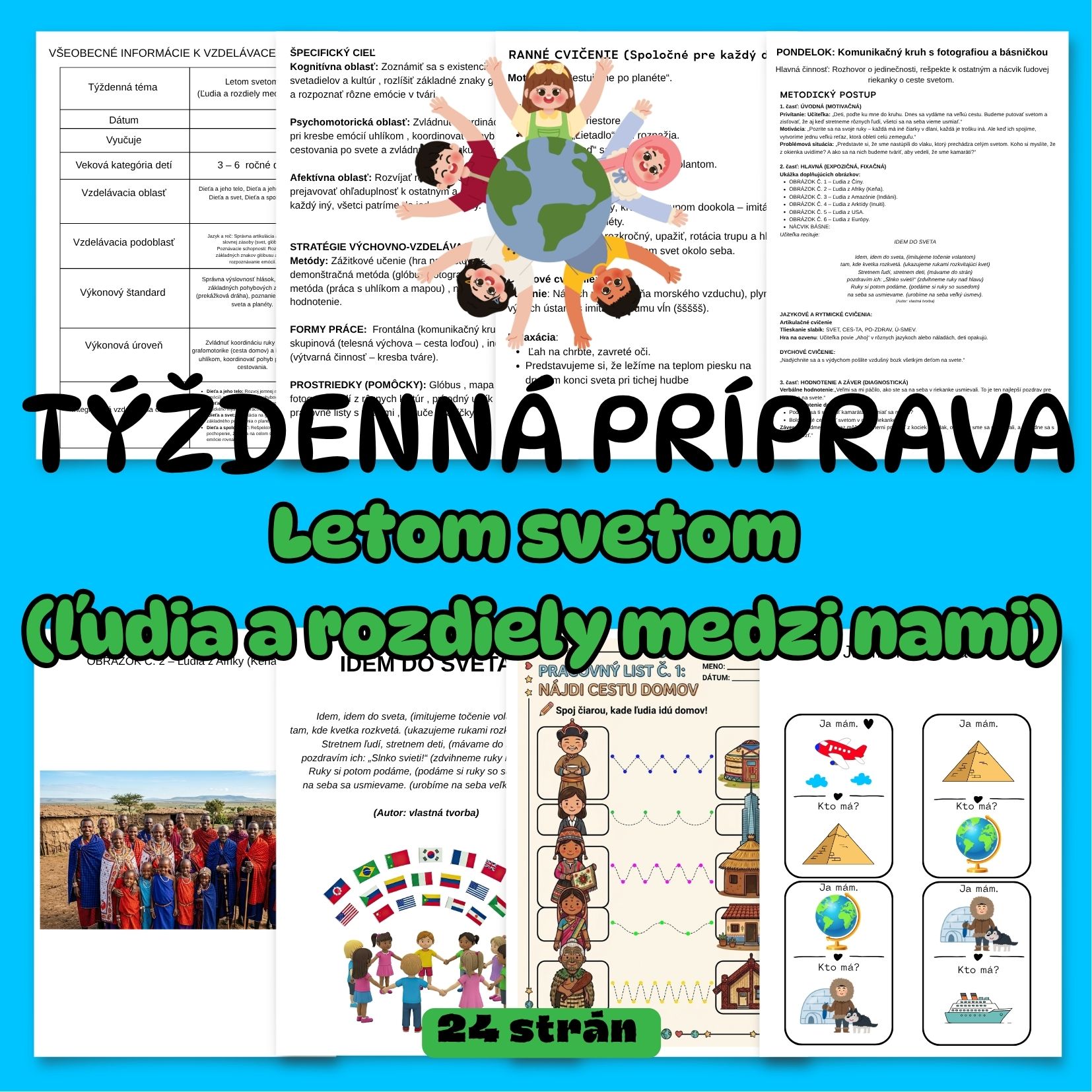 Tento materiál je komplexná týždenná príprava pre učiteľov v MŠ s názvom „Letom svetom (Ľudia a rozdiely medzi nami)“. Je navrhnutý pre deti vo veku 3 – 6 rokov a zameriava sa na rozmanitosť sveta, kultúr a emócií. Štruktúra týždňa Pondelok (Každý sme iný): Rozhovor o jedinečnosti, nácvik autorskej básne „Idem do sveta“ a prezeranie fotografií ľudí z rôznych kontinentov. Utorok (Hudobná výchova): Práca s glóbusom a mapou sveta. Nácvik piesne „Cestovní“ (alebo slovenskej alternatívy) a rytmizácia slov pomocou ozvučných drievok. Streda (Výtvarná výchova): Zoznamovanie sa s kultúrami a obydliami sveta. Kresba portrétu kamaráta alebo seba samého s dôrazom na emócie za použitia uhlíka či mäkkej ceruzky. Štvrtok (Grafomotorika): Práca s autorským pracovným listom „Nájdi cestu domov“, kde deti prepájajú postavy s ich typickými obydliami. Piatok (Telesná výchova): Tematická prekážková dráha (džungľa, kry, pyramídy, púšť) a pohybová hra „Všetky štáty, vymeňte sa!“. Metodické doplnky Ranné cvičenie: Spoločná rozcvička „Cestujeme po planéte“ s prvkami jógy a dychovými cvičeniami. Hra „Ja mám, kto má?“: Bonusová aktivita s 20 kartičkami (napr. loď, iglu, panda, pas), ktorá u detí rozvíja pozornosť a slovnú zásobu. Vzdelávacie ciele: Rozvoj rešpektu k odlišnostiam, empatie, orientácie v priestore a poznávanie rozmanitosti planéty. Súbor je možné využiť ako brožúru.