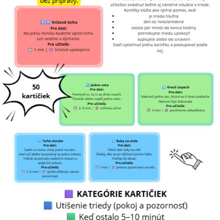 Stačí vybrať kartičku podľa potreby triedy, prečítať deťom inštrukciu a postupovať podľa poznámky pre učiteľa. Kartičky sú farebne odlíšené podľa kategórií, aby ste ich rýchlo našli.