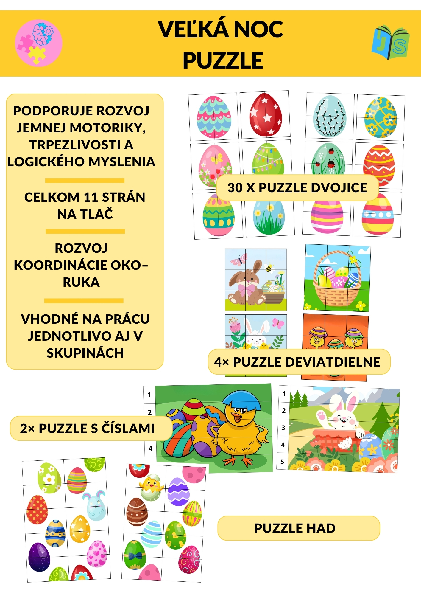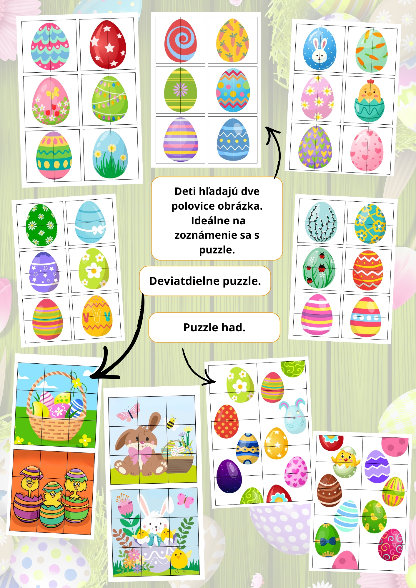 Súbor Veľká noc: puzzle je hravá vzdelávacia aktivita zameraná na rozvoj zrakového vnímania, pozornosti, jemnej motoriky a logického myslenia.