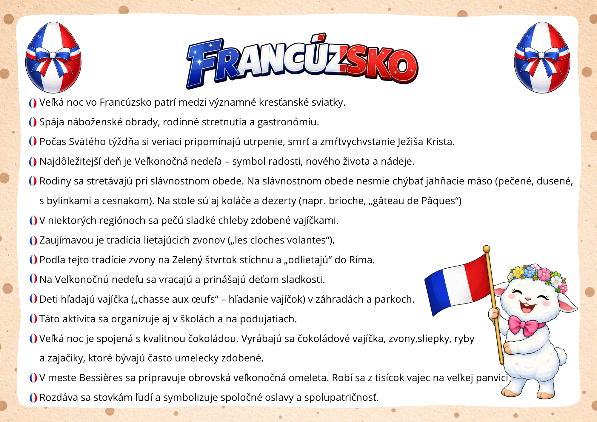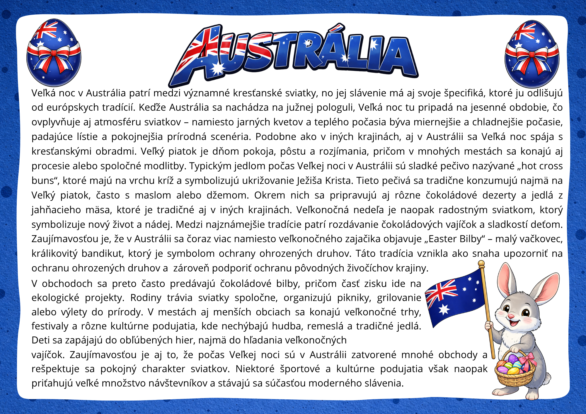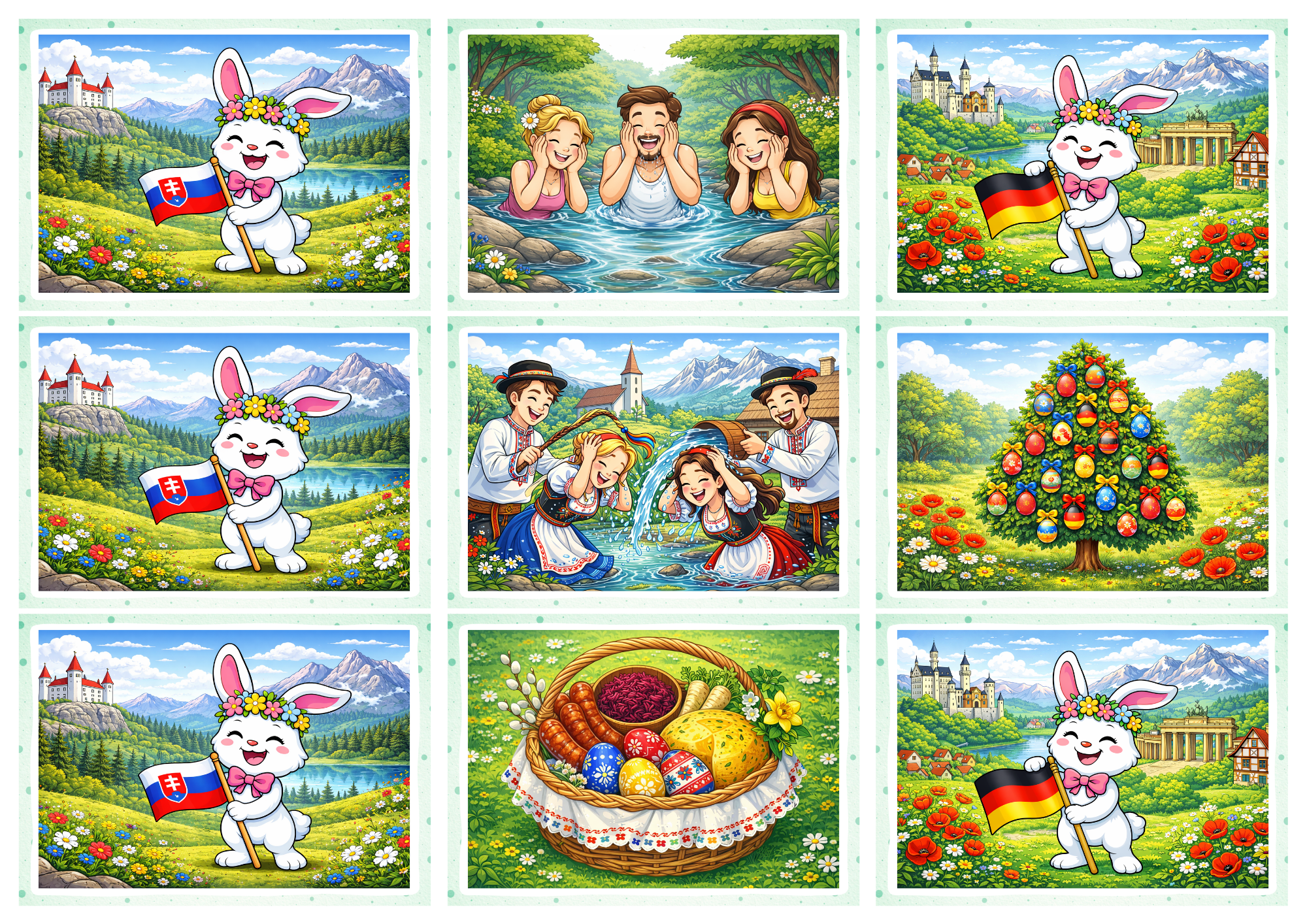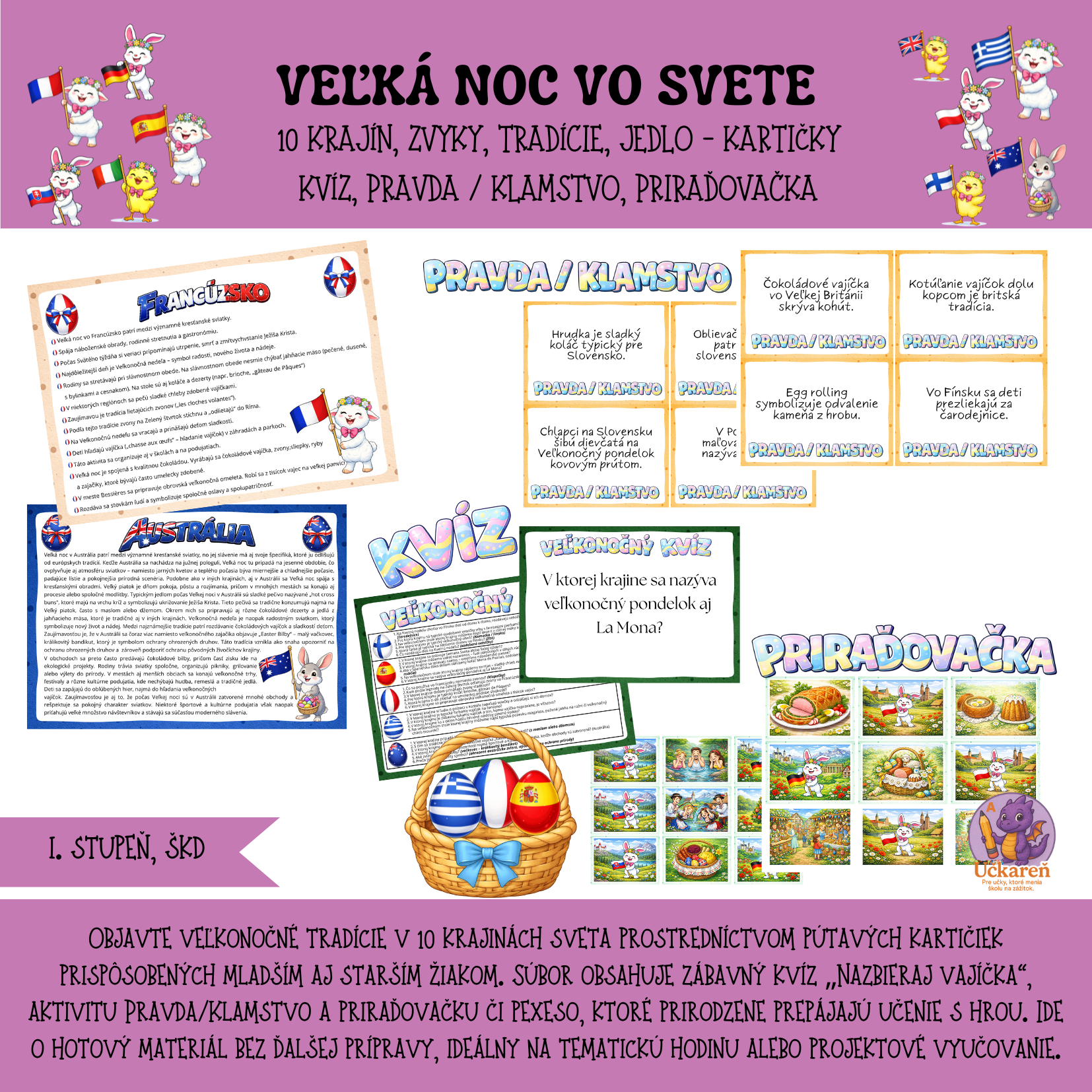 Tento súbor ponúka komplexný a zábavný spôsob, ako žiakom priblížiť veľkonočné tradície v 10 krajinách sveta. Obsahuje kartičky spracované v dvoch úrovniach náročnosti – stručné body pre mladších žiakov a súvislé texty pre starších, vďaka čomu je materiál ľahko prispôsobiteľný rôznym vekovým skupinám. Súčasťou je aj veľkonočný kvíz „Nazbieraj vajíčka“, aktivita Pravda/Klamstvo a priraďovačka obrázkov ku krajinám, ktorú je možné využiť aj ako pexeso.