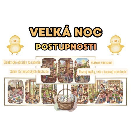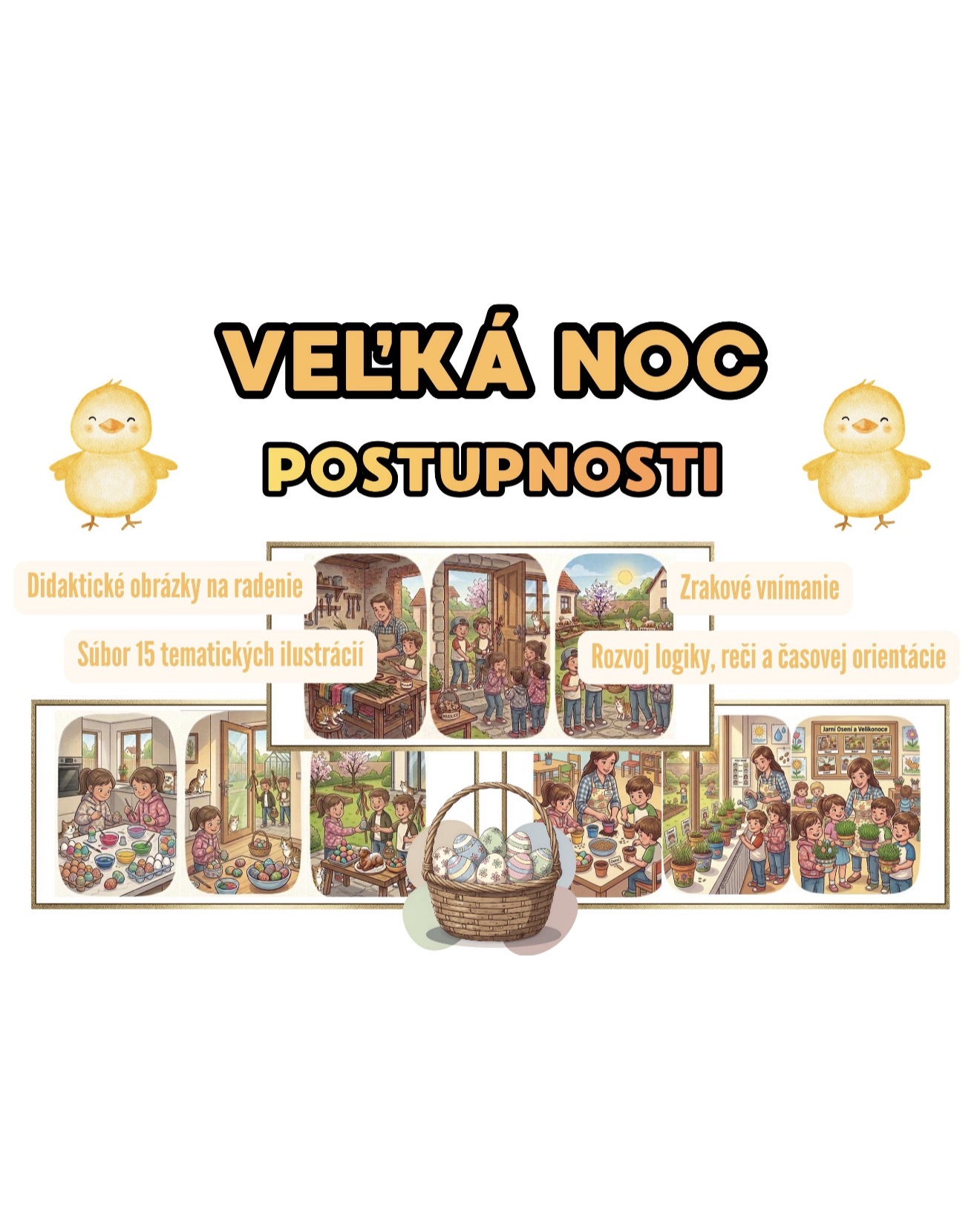 Veľkonočné postupnosti – Príbehy v obrázkoch Tento súbor obsahuje 15 farebných didaktických kariet, ktoré deťom v materskej škole približujú veľkonočné tradície a jarné zvyky. Obrázky sú rozdelené do 5 dejových línií (každá po 3 nadväzujúcich scénach), ktoré pomáhajú rozvíjať logické myslenie a časovú orientáciu. Čo v materiáli nájdete? Päť tematických príbehov, ktoré s deťmi môžete rozoberať: Tradičný korbáč: Od pletenia vŕbových prútikov cez koledovanie až po zaslúženú odmenu. Veľkonočné pečenie: Príprava cesta na perníčky, pečenie v rúre a spoločná hostina pri stole. Zdobenie kraslíc: Maľovanie vajíčok v kuchyni a ich následné darovanie koledníkom. Hľadanie nádielky: Schovávanie vajíčok v záhrade, ich hľadanie v tráve a jarný piknik. Jarné tvorenie a osivo: Sadenie semienok do kvetináčov, pozorovanie, ako rastú, a výroba vencov na dvere. Vzdelávací prínos: Rozvoj reči: Deti opisujú, čo vidia, a učia sa rozprávať príbeh podľa postupnosti. Logika a čas: Chápanie pojmov „najskôr“, „potom“ a „nakoniec“. Predčitateľská gramotnosť: Na obrázkoch sa objavujú nápisy ako PERNÍČKY, OSENÍ (osivo) alebo VELIKONOCE (Veľká noc), ktoré stimulujú záujem o písmená. Zrakové vnímanie: Hľadanie drobných detailov a opakujúcich sa prvkov (napr. motív mačky na kartách).