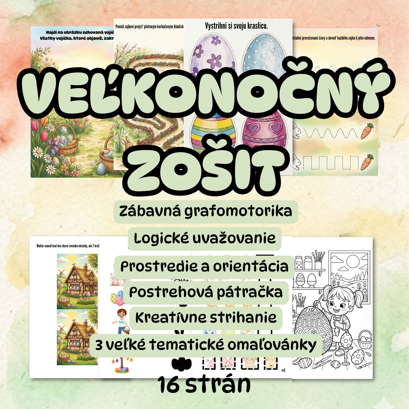 Veľkonočné putovanie: Súbor pracovných listov a omaľovánok Tento tematický zošit je ideálnym spoločníkom pre deti v predškolskom a mladšom školskom veku. Ponúka vyvážený mix aktivít, ktoré zabavia, ale zároveň nenásilne rozvíjajú dôležité zručnosti. Čo v súbore nájdete? Hravá grafomotorika: Deti pomáhajú hladným zajkom doskákať k mrkvičke obťahovaním prerušovaných čiar. Priestorová orientácia: Cesta pleteným korbáčovým bludiskom až ku košíku s výslužkou. Tréning postrehu: Vyhľadávanie a krúžkovanie schovaných vajíčok na obrázku. Detektívna úloha: Hľadanie 7 rozdielov medzi dvoma obrázkami jarného domčeka. Logické myslenie: Priraďovanie správnych tieňov k veľkonočným motívom. Logické rady založené na vystrihovaní a lepení správnych symbolov. Nácvik práce s nožnicami: Niekoľko strán venovaných strihaniu vlastných ozdobných kraslíc. Kreatívna relaxácia: 3 veľké detailné omaľovánky (košík, maliarka, šibač) pre uvoľnenie ruky a fantázie. Súbor je možné využiť ako brožúru.