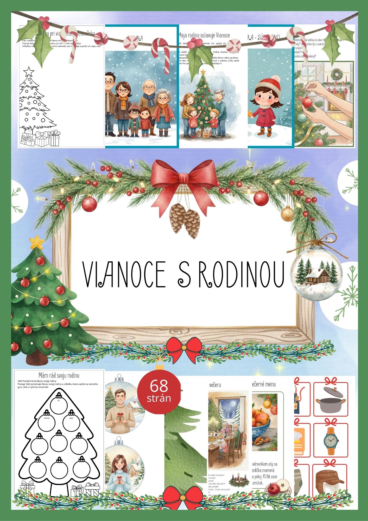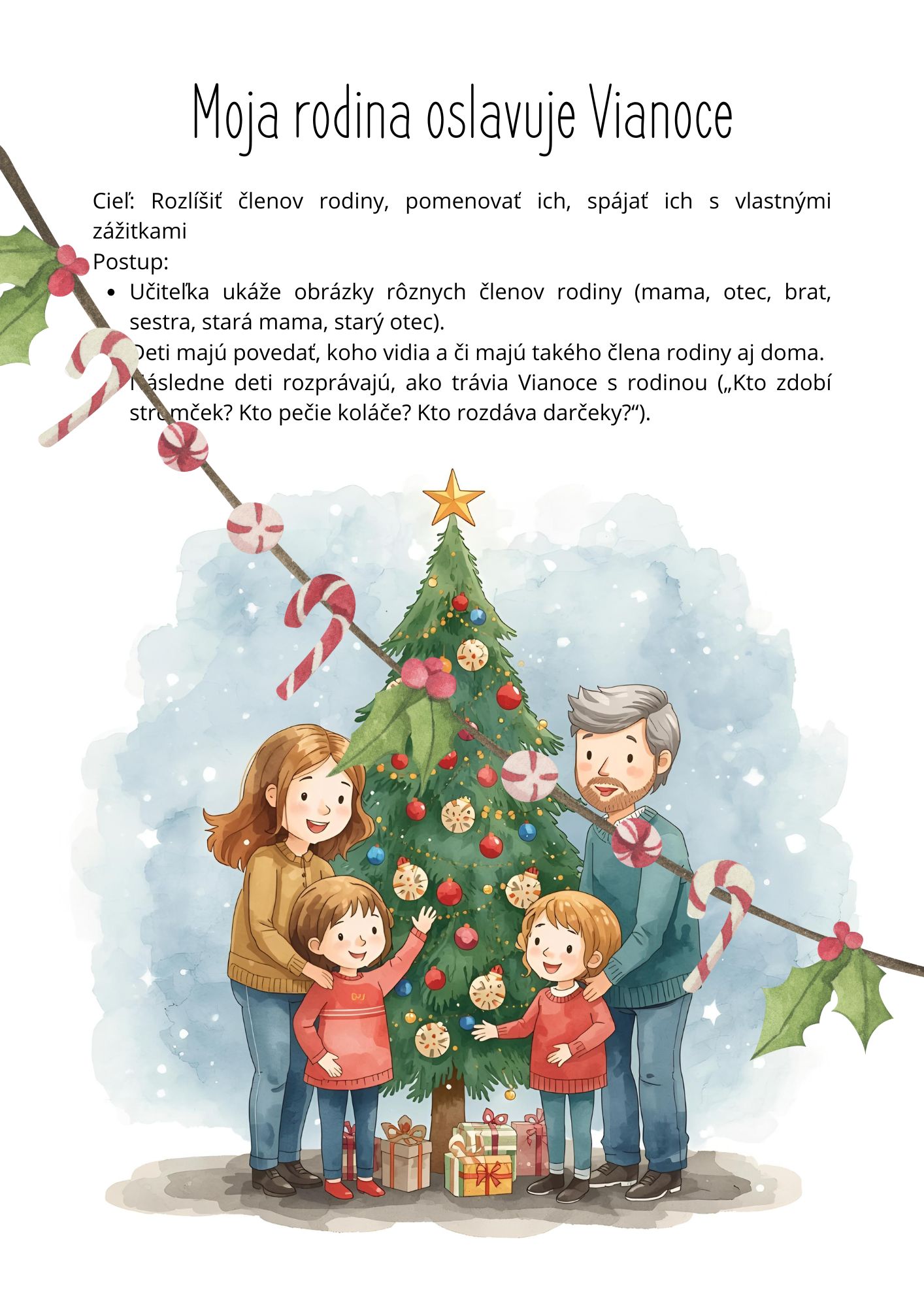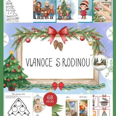 Komplexný vzdelávací PDF materiál pre deti 4–6 rokov, ktorý spája Vianoce a rodinu. Bohatý na obrázky a interaktívne aktivity, podporuje poznávanie členov rodiny, rozvoj slovnej zásoby, jemnú motoriku a empatiu.