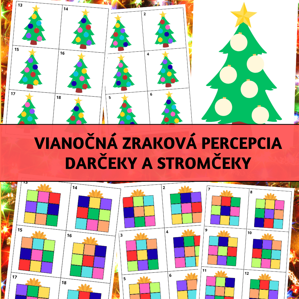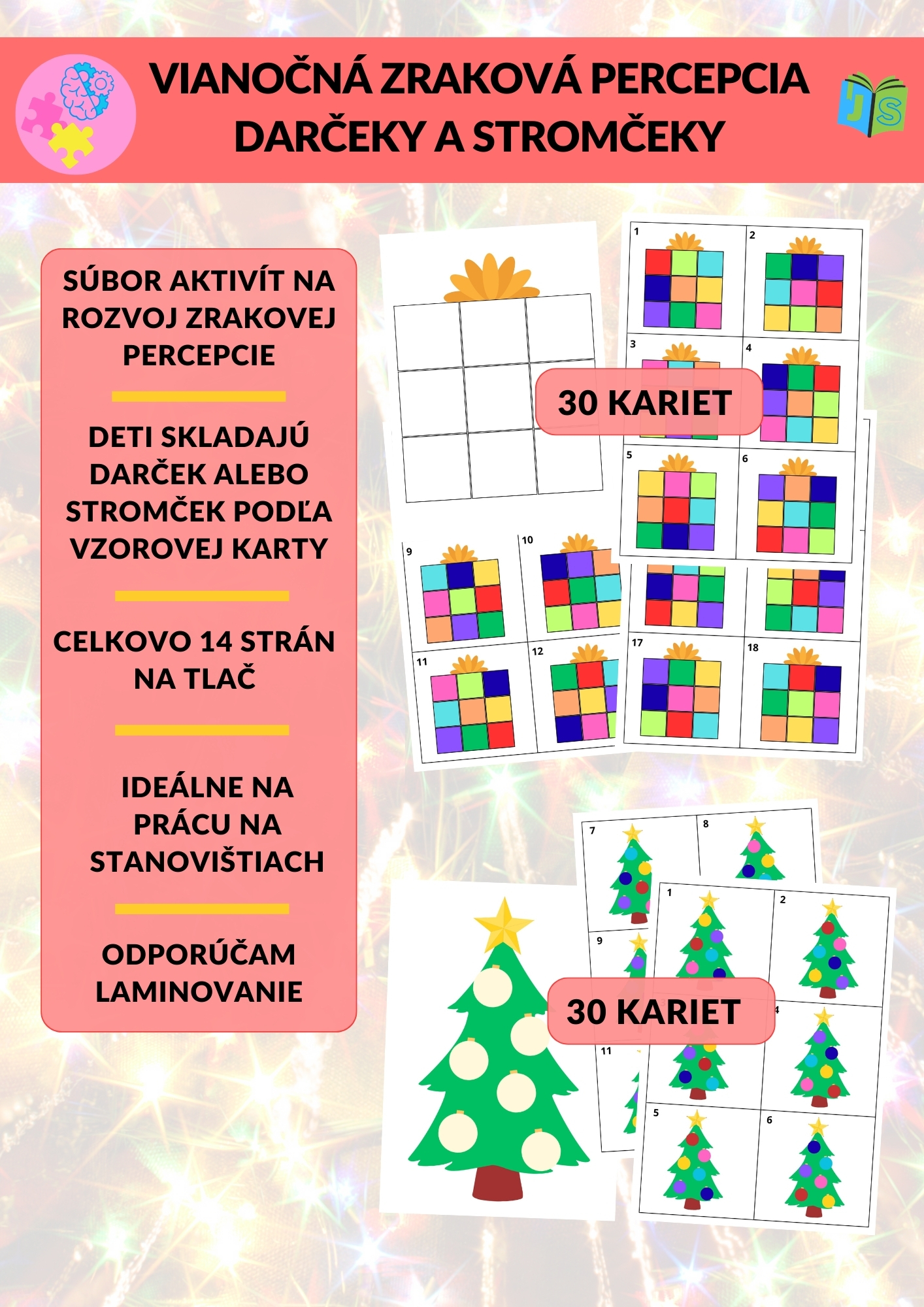 Táto sada Vianočná zraková percepcia: Darčeky a stromčeky obsahuje 60 unikátnych kariet, ktoré rozvíjajú vizuálnu pamäť, pozornosť k detailu a priestorovú orientáciu. Deti skladajú farebné darčeky a vianočné stromčeky podľa vzorovej karty, porovnávajú obrázky, trénujú presné kopírovanie a prácu podľa inštrukcií.
