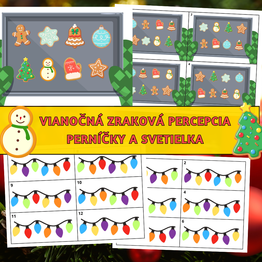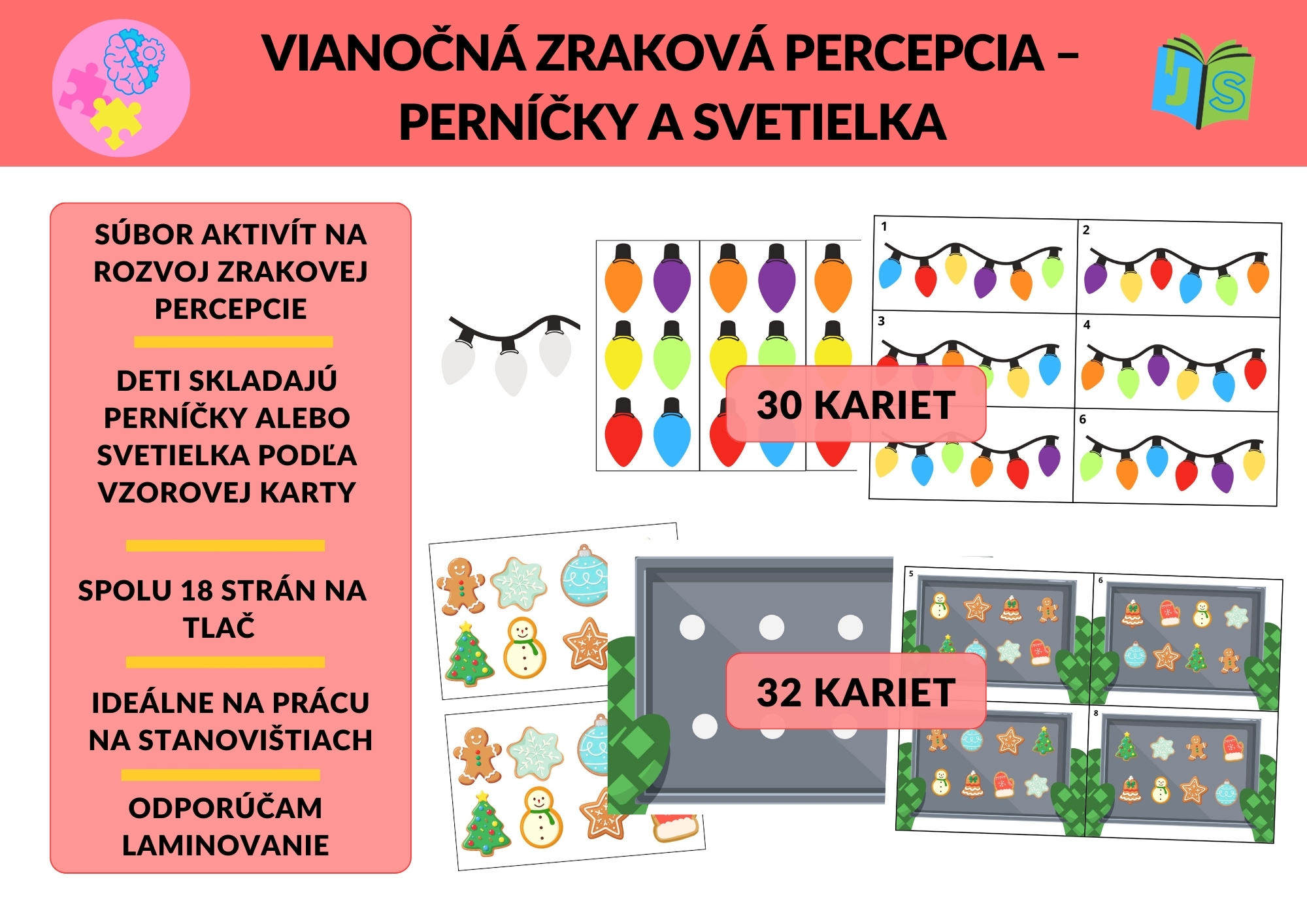 Tento vianočný súbor ponúka hravé aktivity zamerané na rozvoj zrakovej percepcie, pozornosti k detailu, vizuálnej pamäti a priestorovej orientácie. Deti skladajú farebné svetielkové rady a vianočné perníčky na plech podľa vzorových kariet.