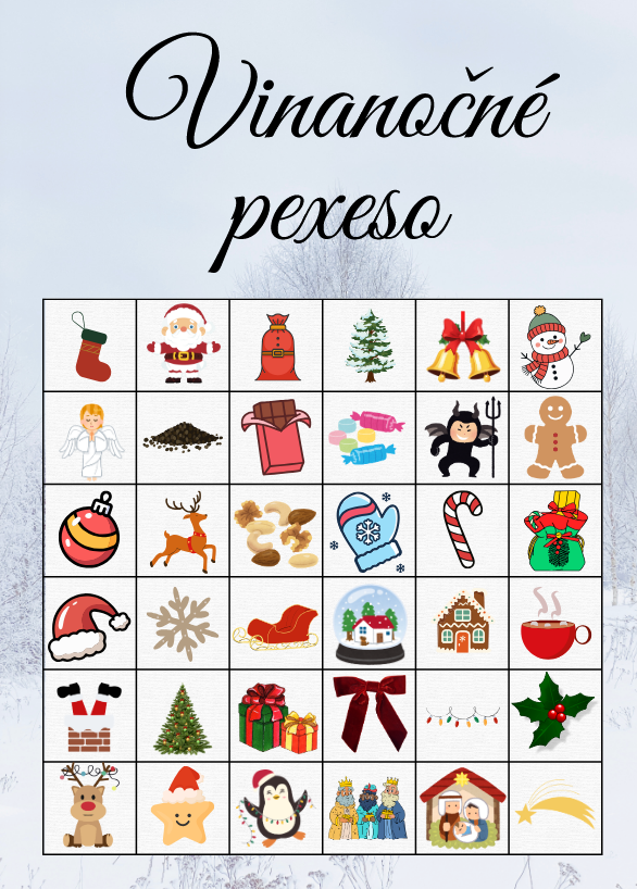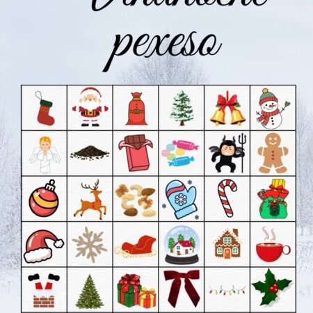 Súbor obsahuje 8 strán (A4), na ktorých sa nachádzajú obrázky s vianočnou tématikou. Pexeso obsahuje 36 obrázkov. Na jednej A4 strane sa nachádza 12 obrázkov.