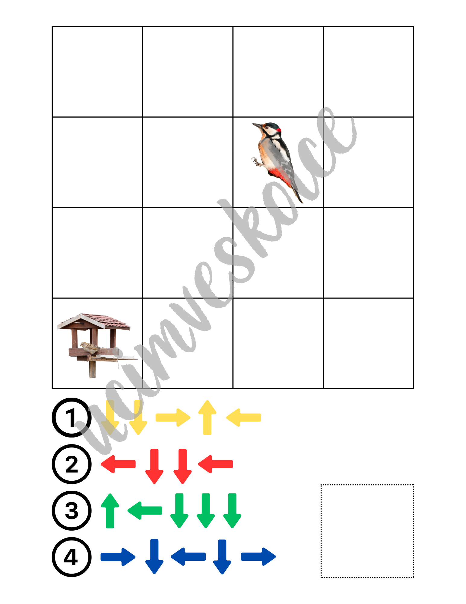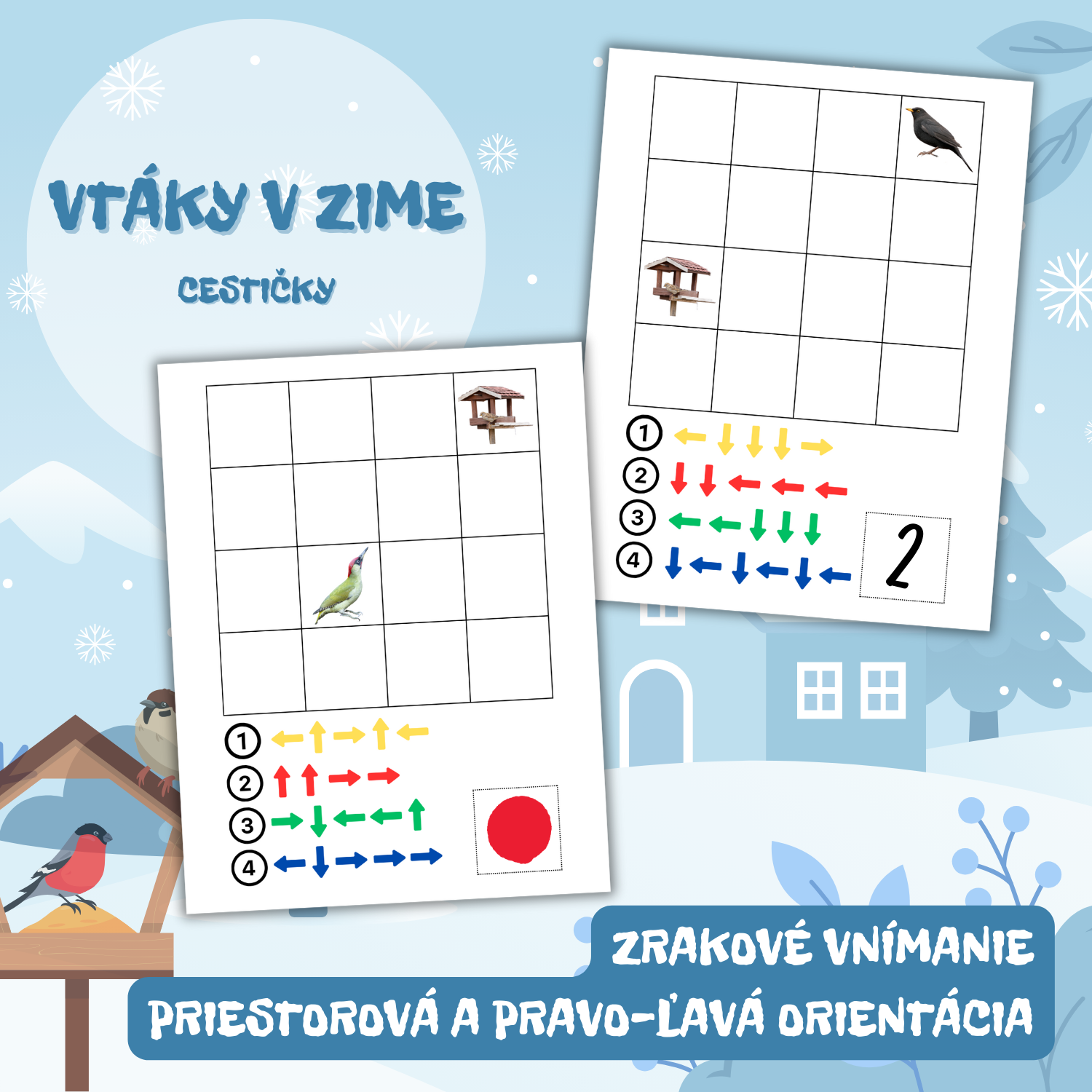Úlohou detí je zistiť, ktorá cesta vedie z políčka s obrázkom vtáka na políčko s obrázkom krmítka.
