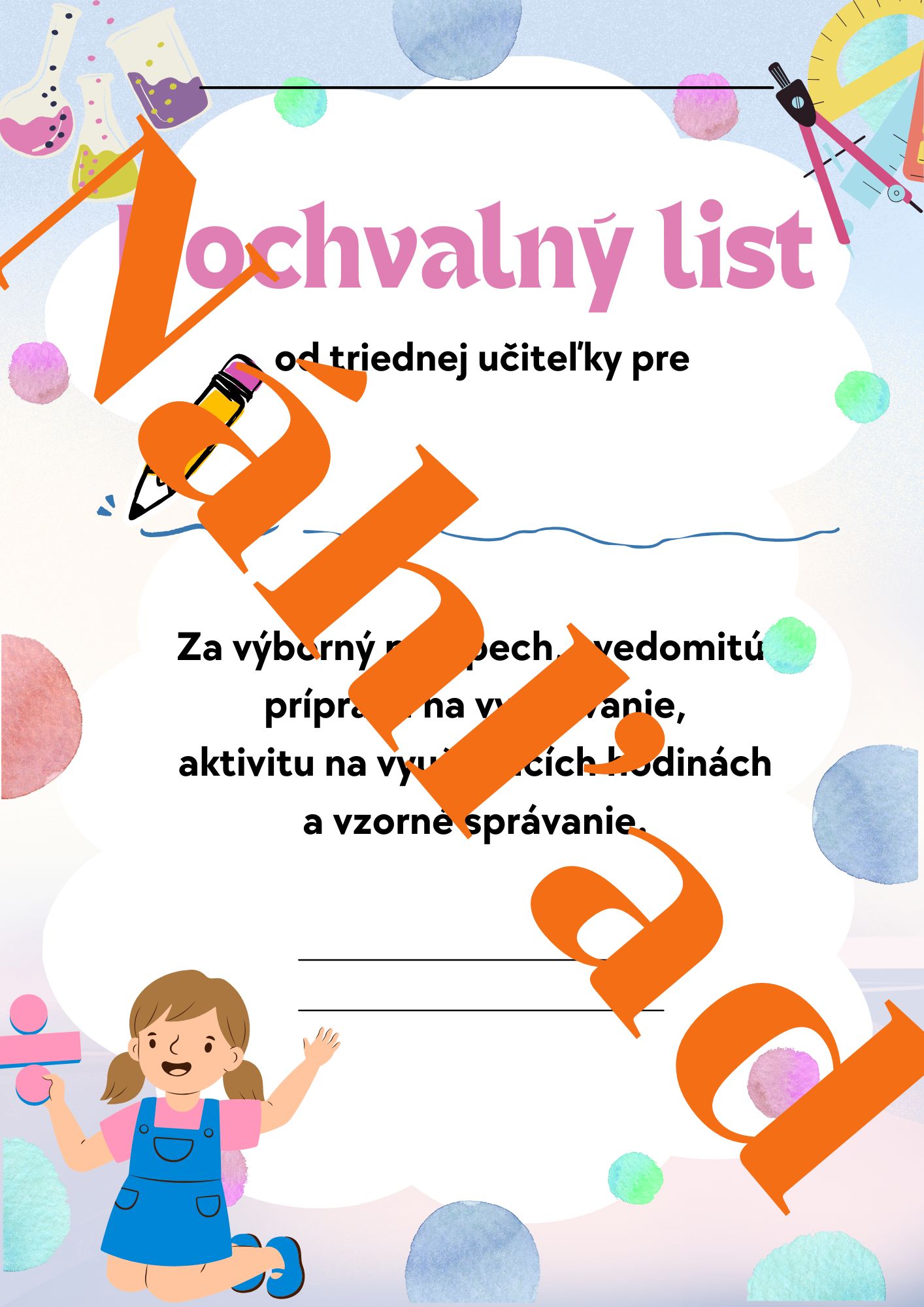 Na vysvedčení je možné doplniť názov školy, školský rok, triedu, meno učiteľa/učiteľky a dátum. Rovnako aj na pochvalnom liste si môžete upraviť názov školy, školský rok, triedu, meno učiteľa/učiteľky a dátum podľa vlastných potrieb. V prípade potreby úpravy koloniek ma kontaktujte.