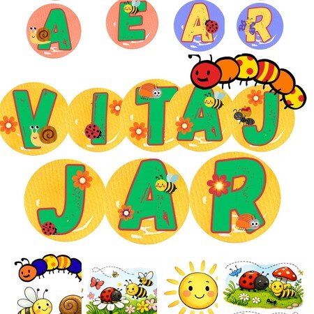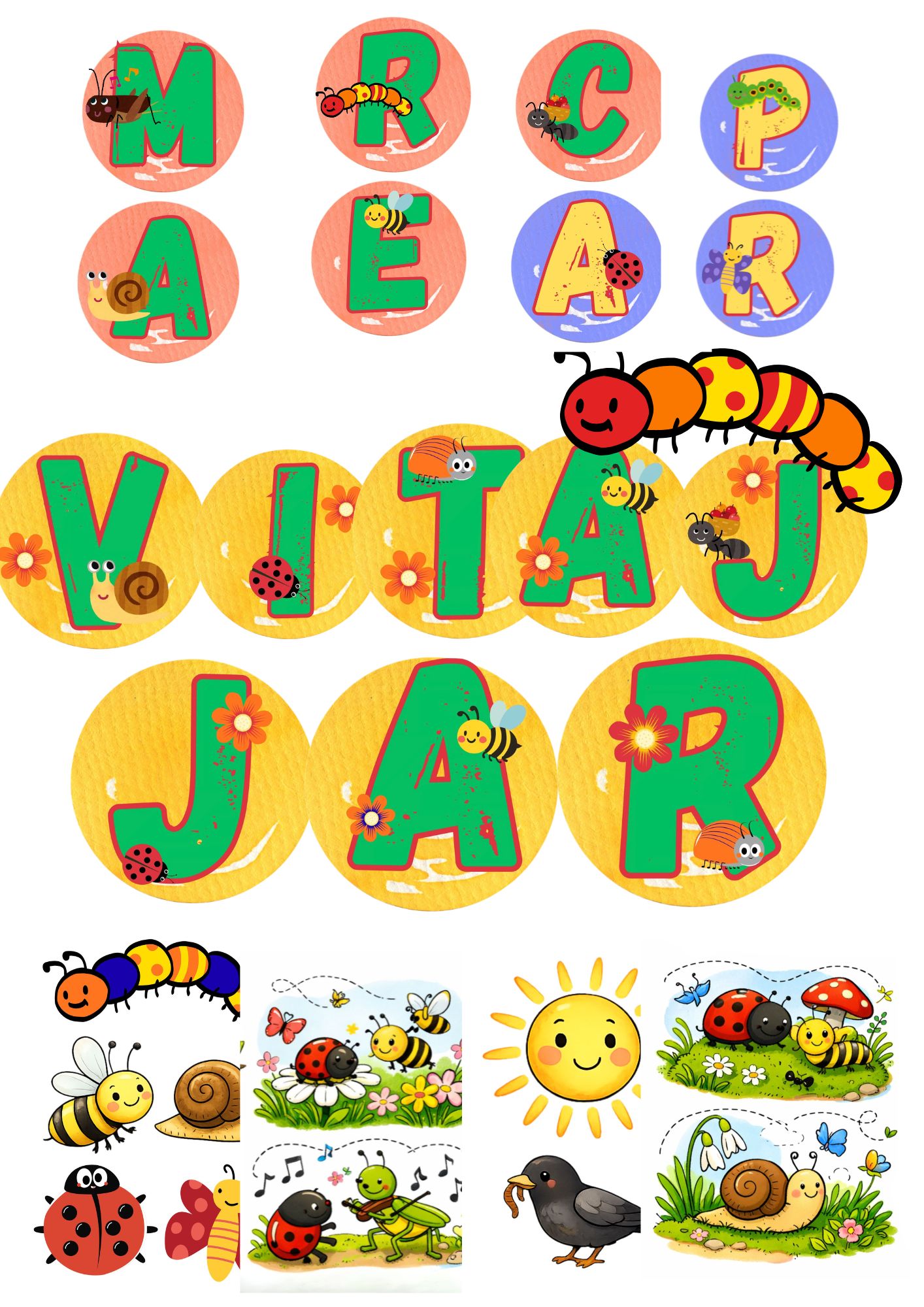 Materiál obsahuje nápis Vitaj, jar, názvy jarných mesiacov marec, apríl, máj a tematické jarné obrázky.