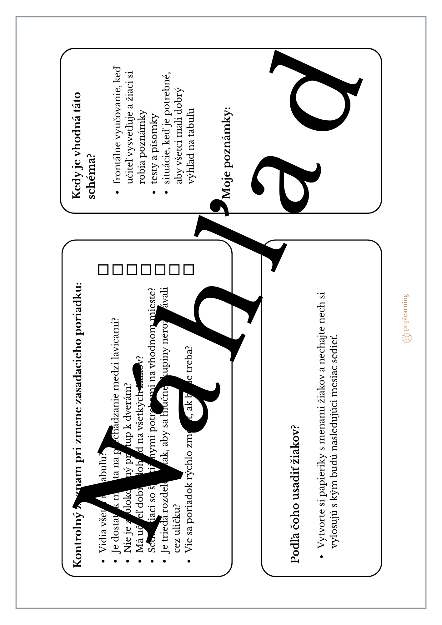 - Podľa checklistu si skontrolujete, či všetci žiaci vidia na tabuľu, či je dostatok miesta na prechádzanie, či má učiteľ dobrý dohľad atď.