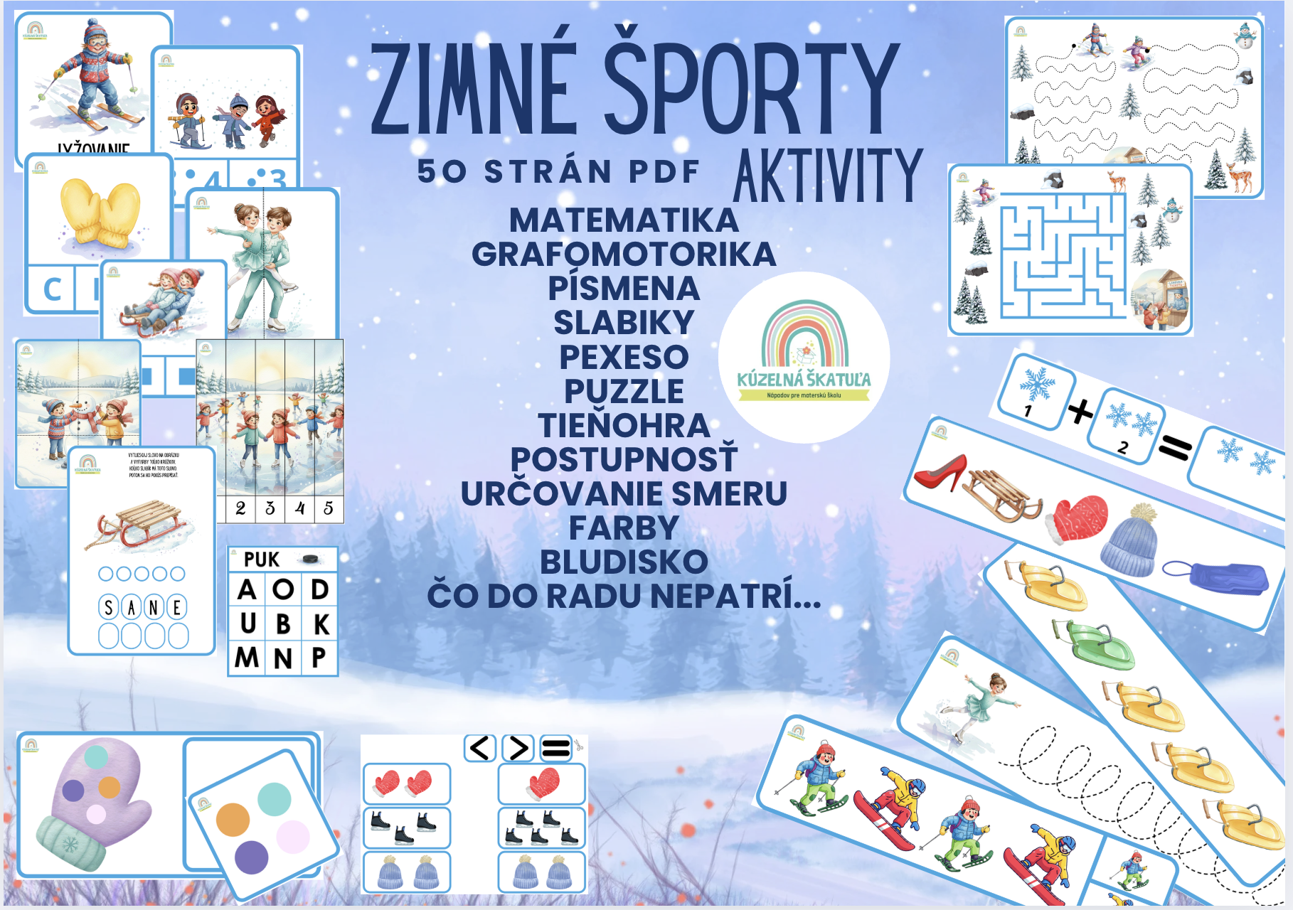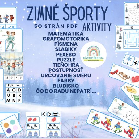 Ahojte! Ponúkam na predaj svoj autorský vzdelávací súbor na tému Zima a zimné športy. Je to komplexný balík vo formáte PDF, ktorý obsahuje 50 strán plných aktivít. Súbor som vytvorila s láskou tak, aby deťom priblížil čaro zimy aj športovania na snehu a hravou formou rozvíjal ich zručnosti.
