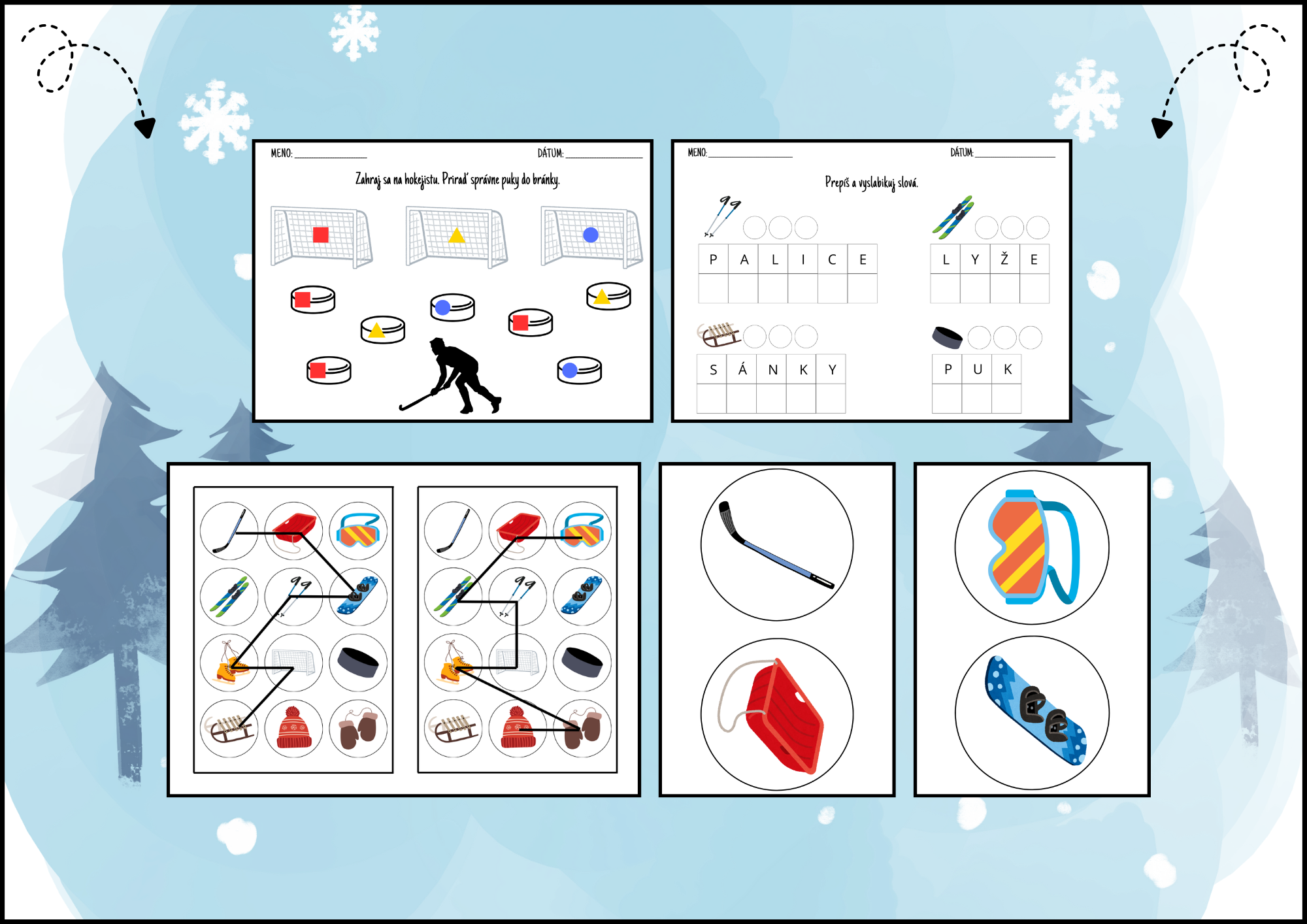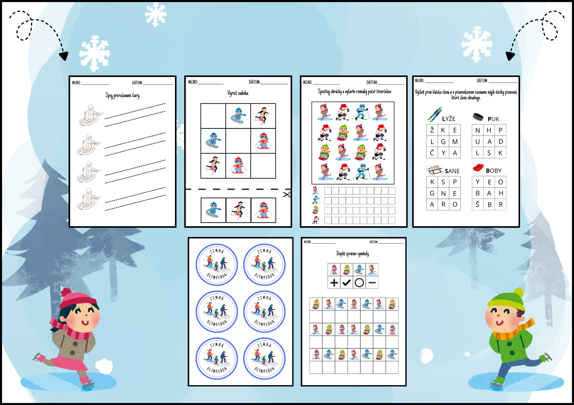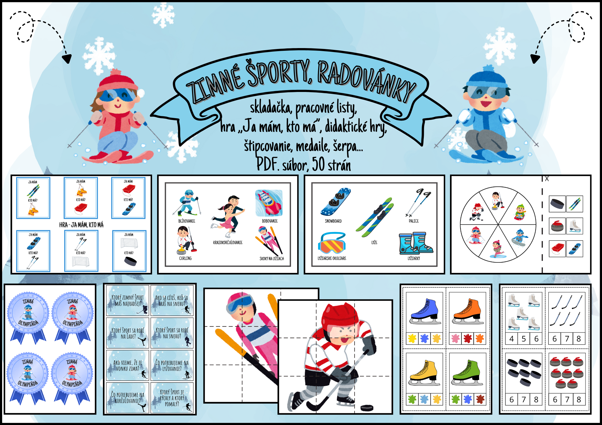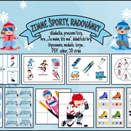 Milé pani učitel'ky, vychovávateľky, rodičia. Pripravila som si pre vás 50 strán pracovných listov na tému „Zimné športy, radovánky.” V tomto PDF. súbore nájdete: