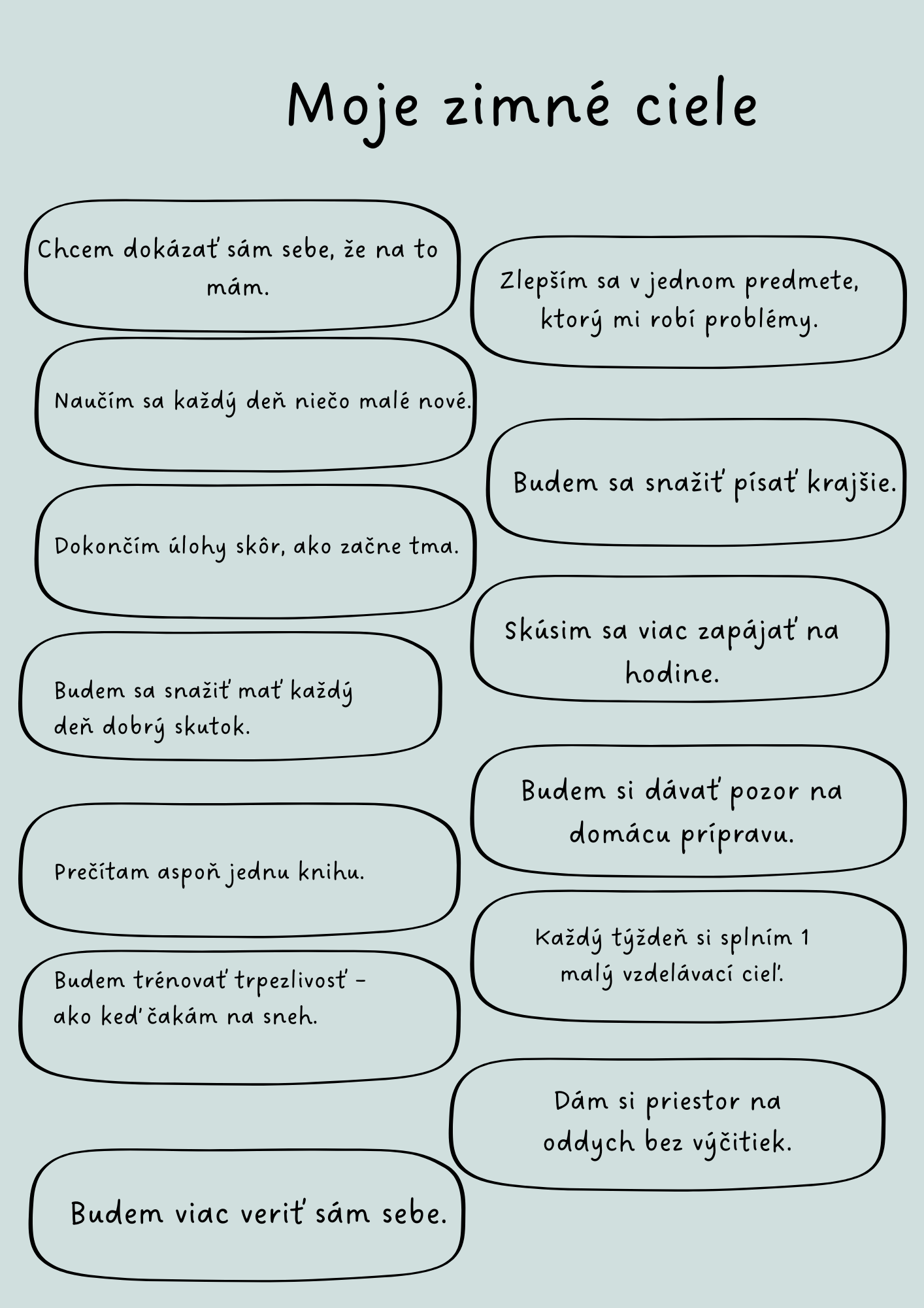 - Žiaci si vyberajú vlastný „zimný cieľ“ alebo mini-výzvu a umiestnia si ju na nástenku, stromček či vlastnú menovku do vrec. Podporuje to zodpovednosť, vnútornú motiváciu aj hravé sebarozvíjanie.