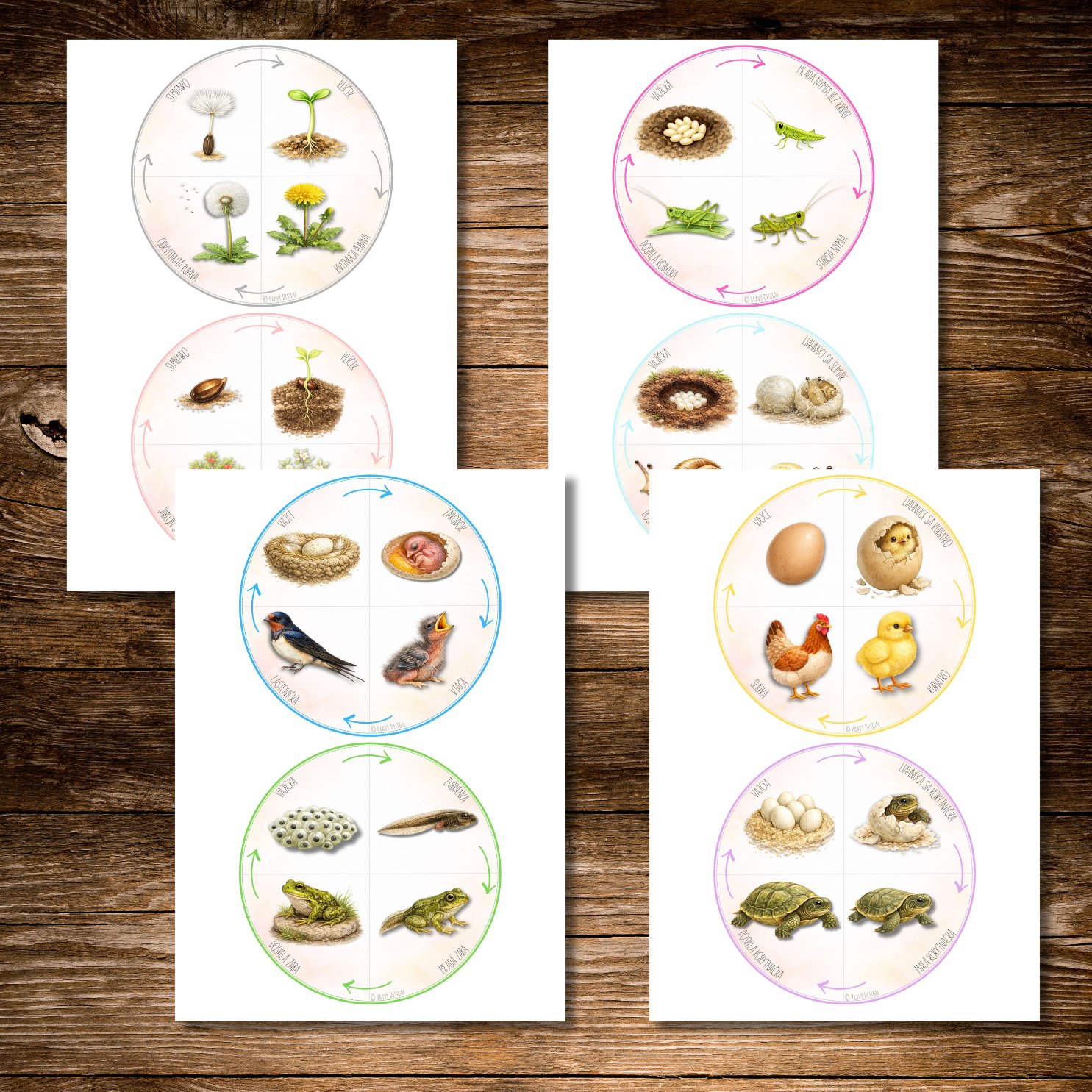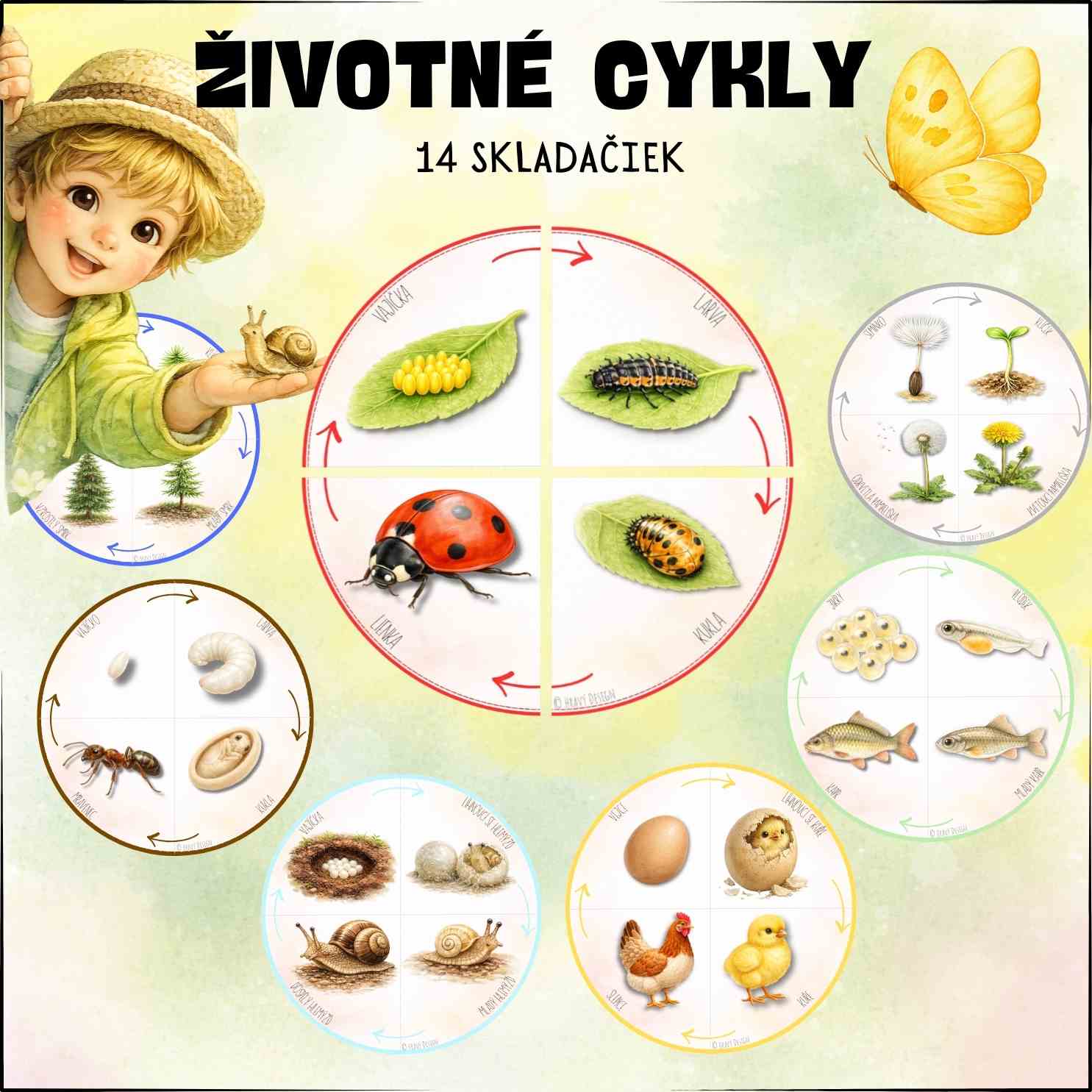 Tento súbor obsahuje vzdelávacie skladačky zamerané na životné cykly rastlín, stromov a živočíchov (napr. hmyzu). Deti si hravou a názornou formou osvoja, ako prebieha vývoj od začiatku až po dospelého jedinca.