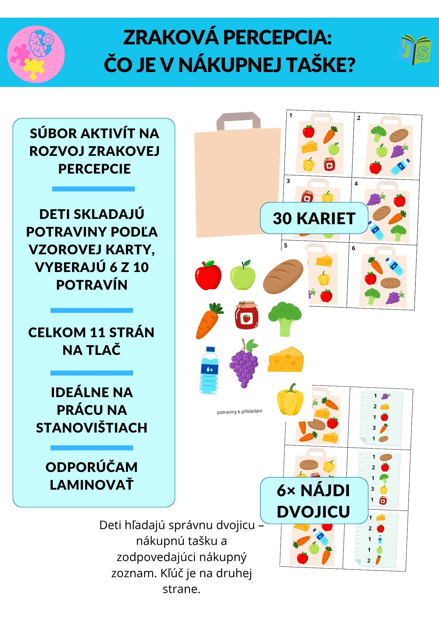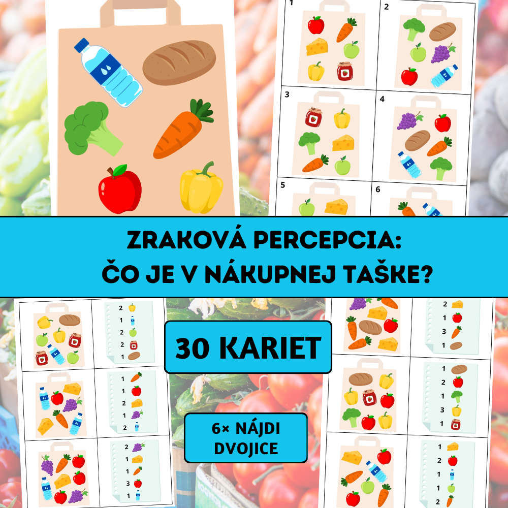 Súbor Zraková percepcia: Čo je v nákupnej taške? je hravá vzdelávacia aktivita zameraná na rozvoj zrakového vnímania, vizuálnej pamäti, koncentrácie pozornosti a priestorovej orientácie.