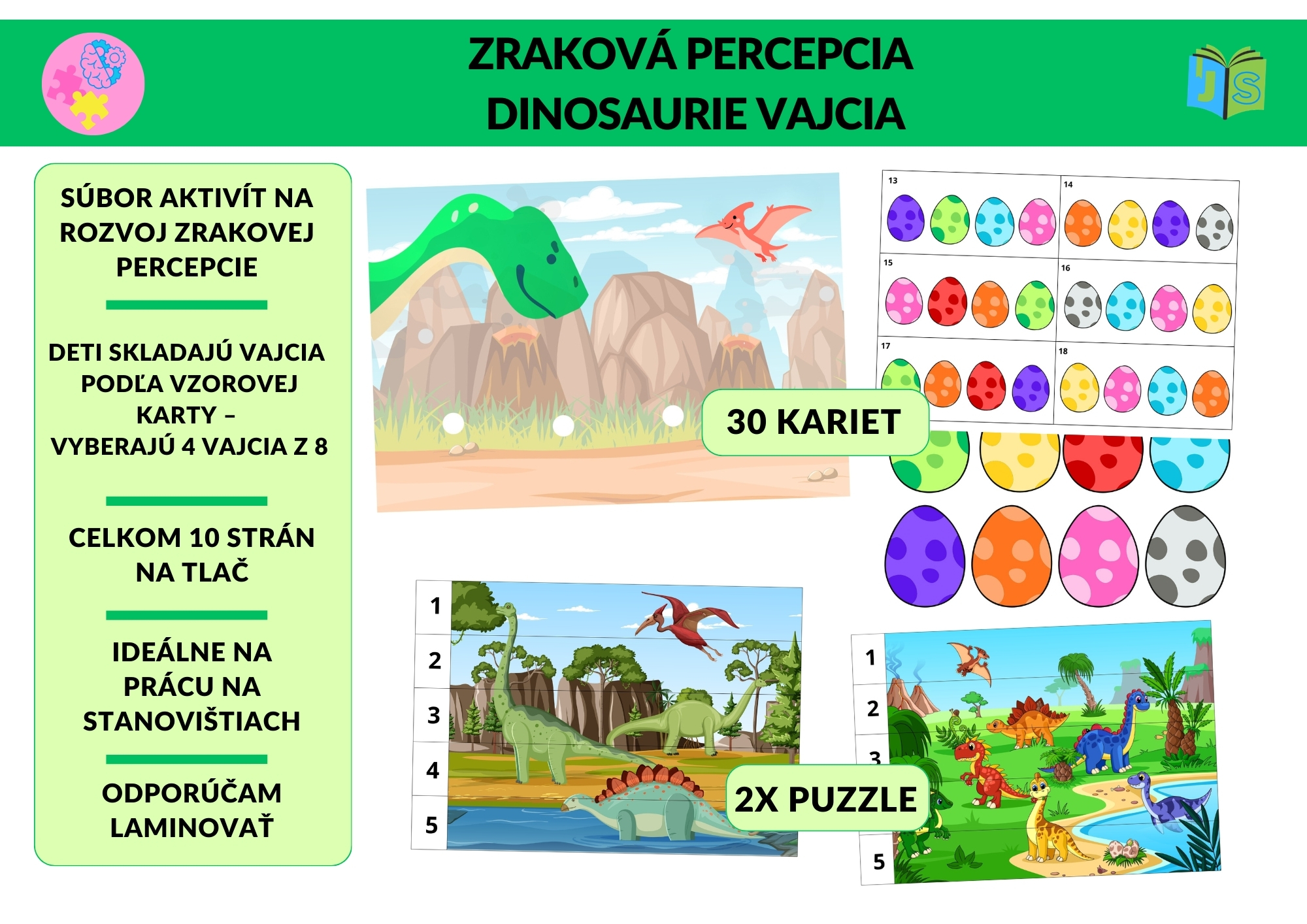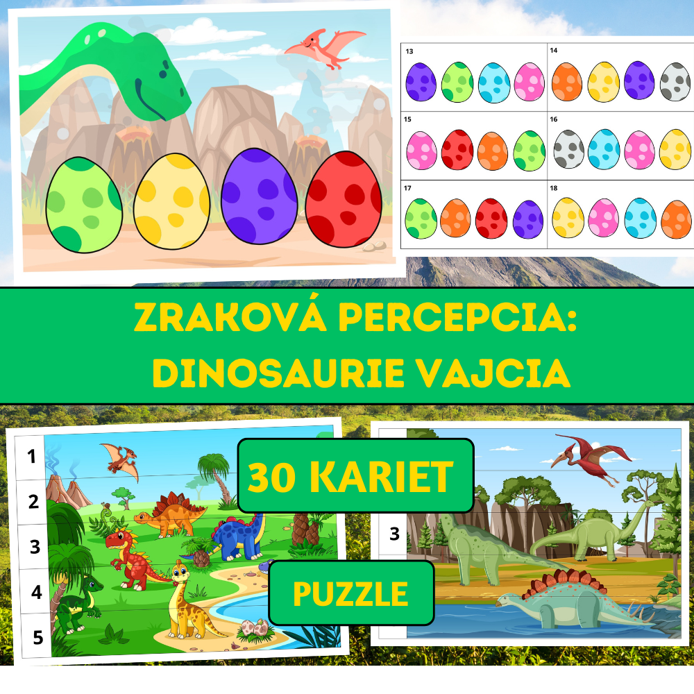 Súbor Zraková percepcia: Dinosaurie vajcia je hravá vzdelávacia aktivita zameraná na rozvoj zrakového vnímania, pozornosti a schopnosti porovnávať detaily.