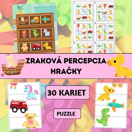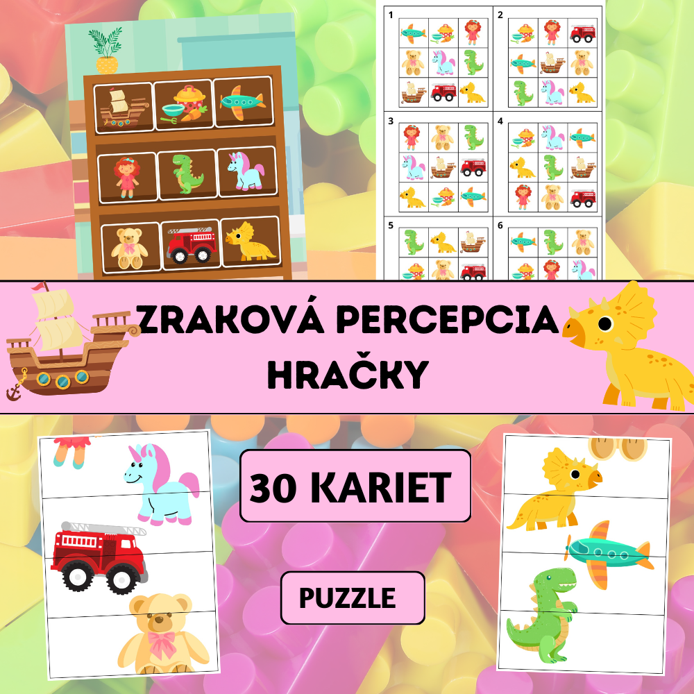 Zraková percepcia – Hračky je vzdelávací materiál zameraný na rozvoj zrakového vnímania, pozornosti k detailu, vizuálnej pamäti a priestorovej orientácie. Deti skladajú obrázky hračiek do mriežky 3 × 3 presne podľa vzorových kariet a učia sa systematicky pracovať podľa predlohy.