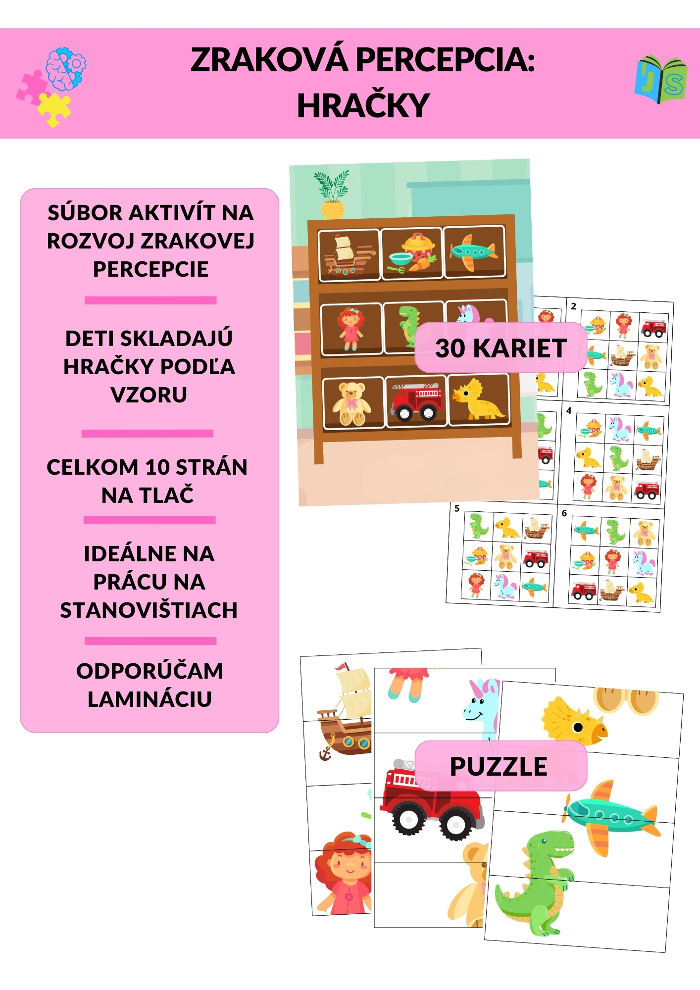 Súčasťou materiálu je aj puzzle s motívom hračiek, ktoré ďalej podporuje zrakovú diferenciáciu a schopnosť vnímať celok a časť.