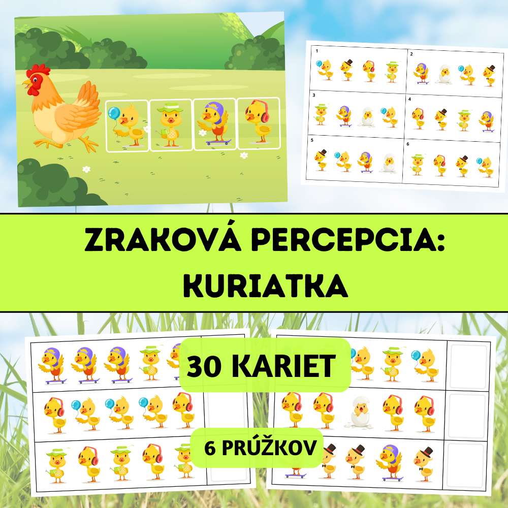 Zraková percepcia – Kuriatka je hravý vzdelávací materiál zameraný na rozvoj zrakového vnímania, pozornosti k detailu, vizuálnej pamäti a logického myslenia. Deti skladajú 4 kuriatka do správneho poradia podľa vzorových kariet a učia sa pracovať systematicky podľa predlohy.